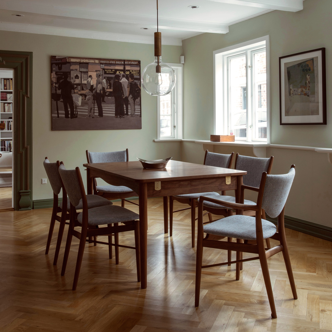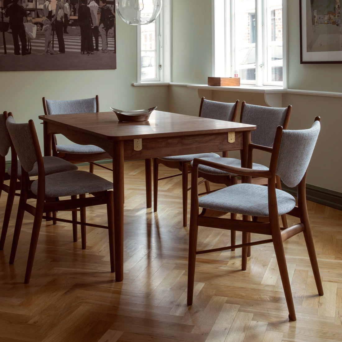 最大の特徴は、「支えるもの(木製フレーム)」と「支えられるもの(座面)」の間に隙間を持たせた、フィン・ユール特有の軽快な構造です。この視覚的な余白があることで、ダイニングに複数脚並べても決して空間が重くなりません。アームの有無に関わらず、視線が奥へとスッと抜け、お部屋全体が広々と、そして洗練された印象に生まれ変わります。