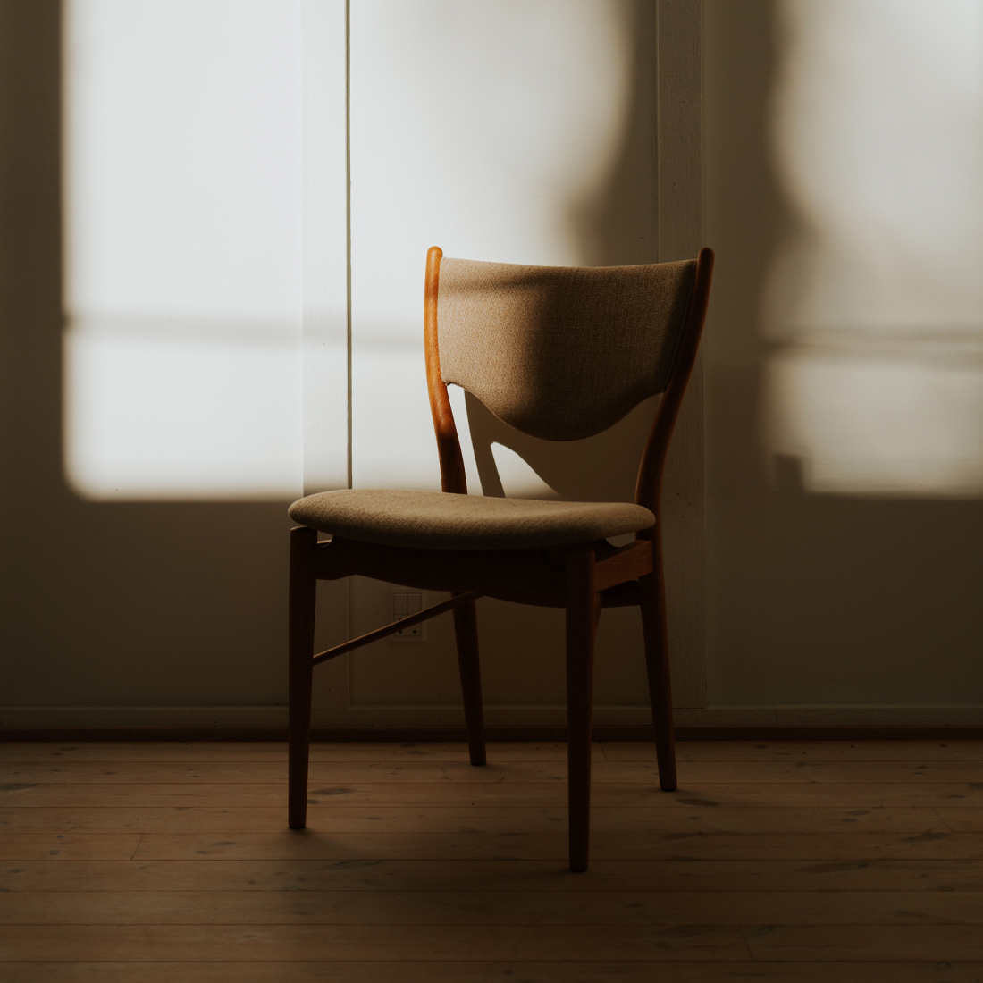 フィン・ユールの作品群の中でも、日常に寄り添う造形として名高い本モデル。その歴史は、1946年に熟練の家具職人ニールス・ヴォッダーのためにデザインされた優美な「46アームチェア」から始まりました。