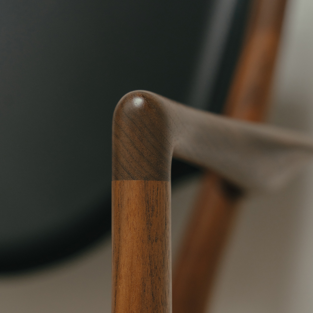 アームに手をかけた瞬間、指先に伝わるのは無垢材の柔らかな温もりです。角を滑らかに落とし、手仕事で丹念に磨き上げた天然木のフレーム(オーク、ウォルナット、チークから選択可)は、有機的で立体的なカーブを描いています。特にアームチェアの肘掛けは、人間の腕の自然な角度に沿うよう緻密に削り出されており、身を委ねればスッと力が抜けるような、至福の心地よさをご体感いただけます。
