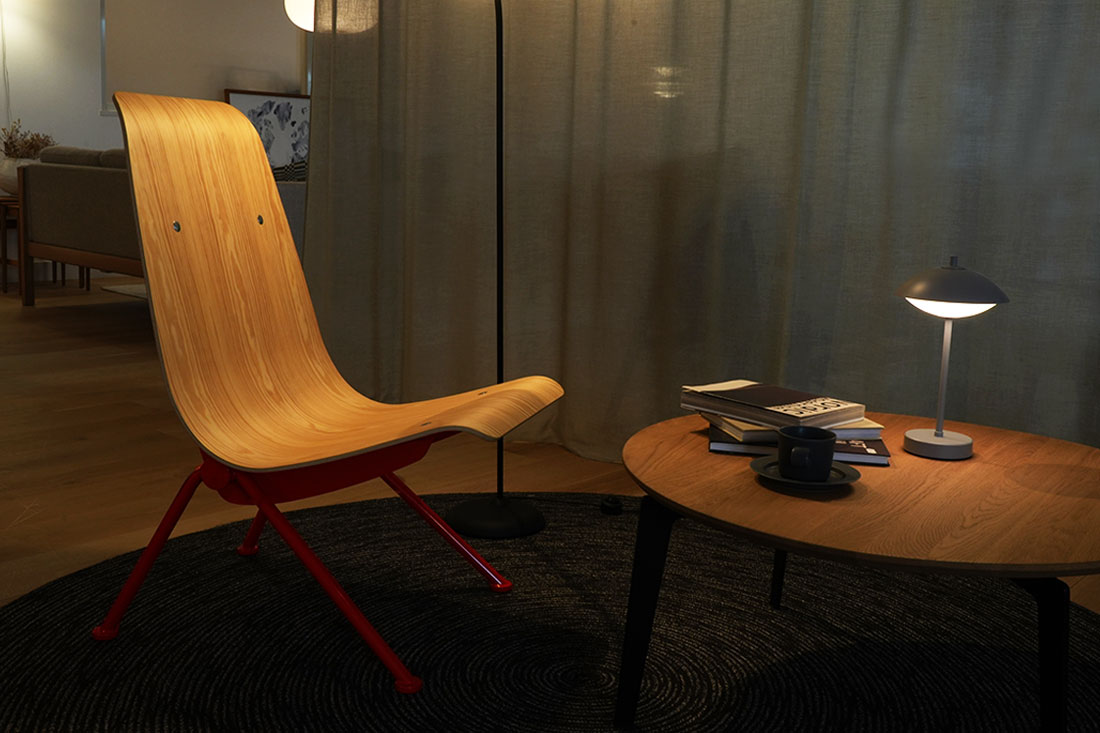 包み込むようなロ-チェアと、凛としたAntony。柔と剛が響き合う空間は、一脚では生まれない特別なリズムを描き出します。