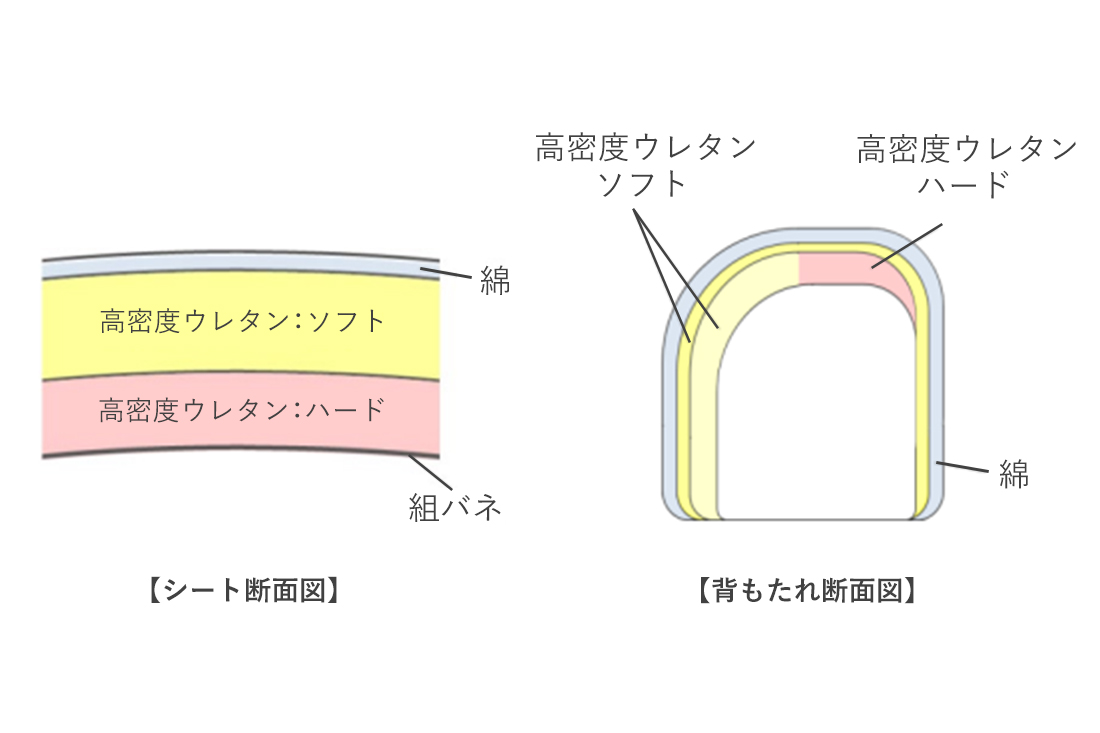シートにはカリモク家具独自の多層クッション構造。2層のウレタンと綿、組バネを組み合わせることで、しっかりと弾力がありながらも体を優しく包み込みます。背もたれも同様にU字型のフレームを採用し、どの向きから座っても体をしっかり支える設計です。