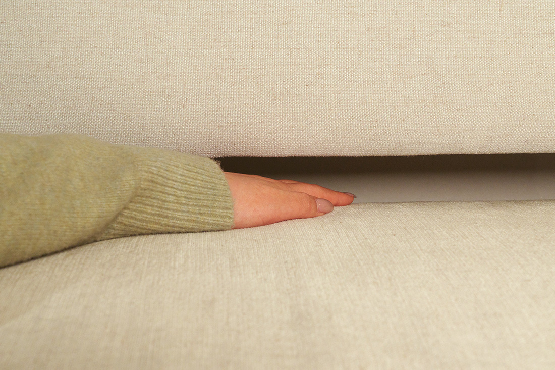普段のお手入れは、固く絞った清潔な濡れタオルでソファ全体を優しく拭いてください。背もたれと座面の間には適度な隙間があり、埃がたまりにくいため、お掃除も簡単です。