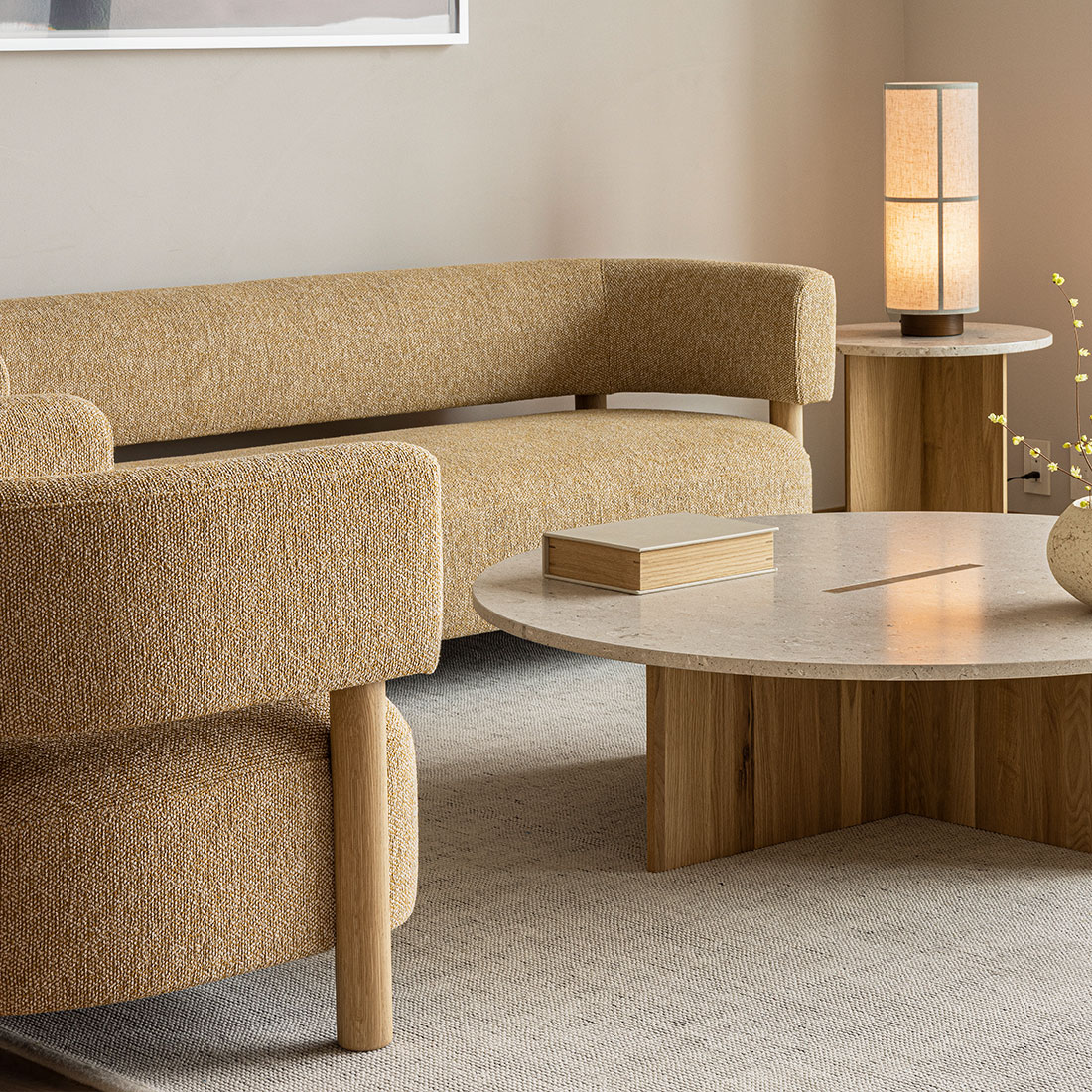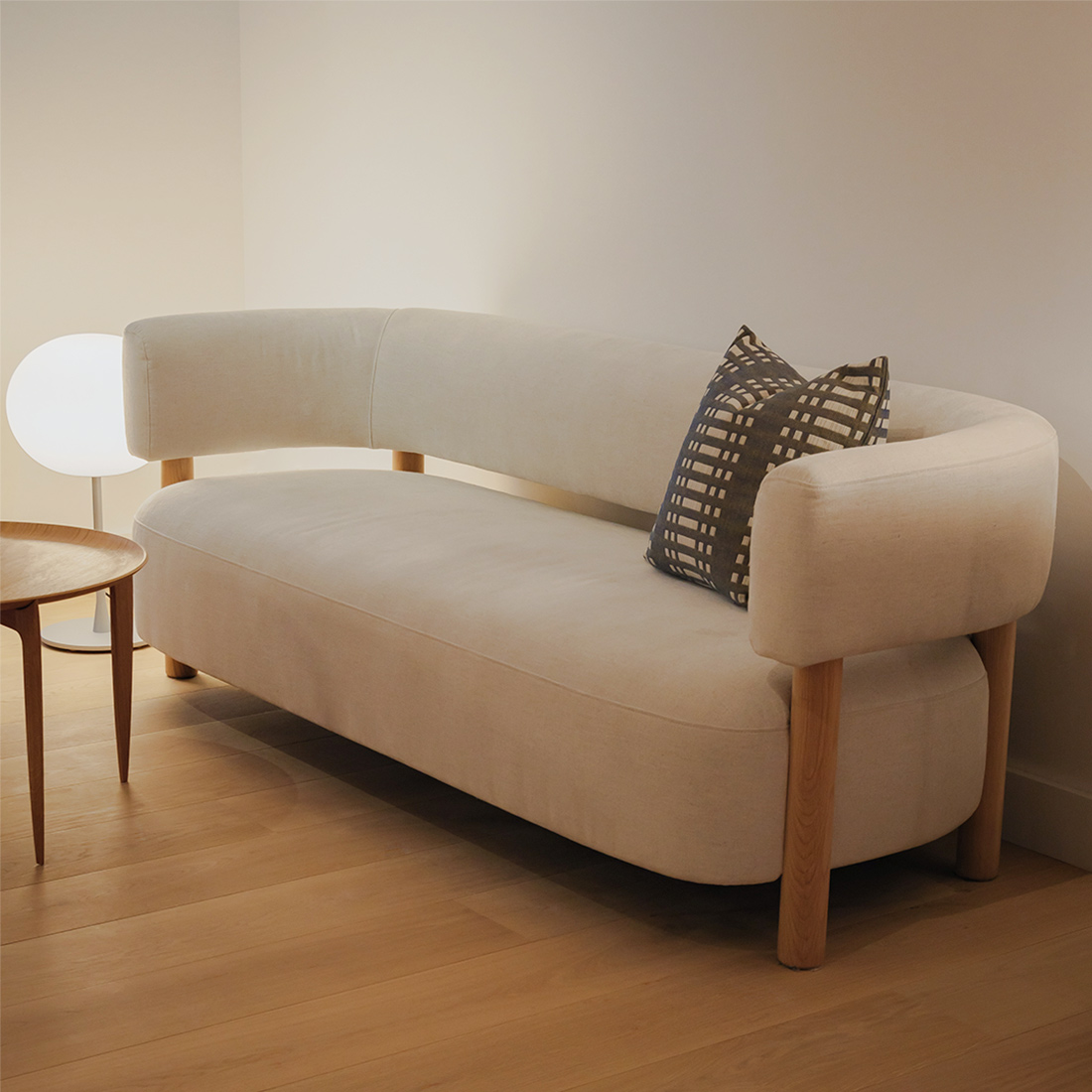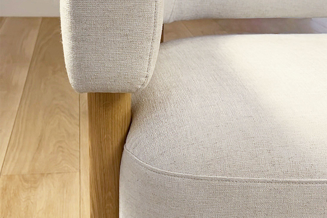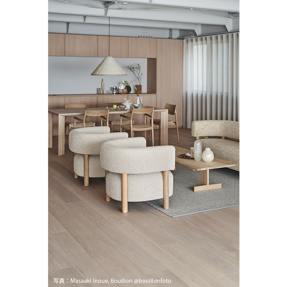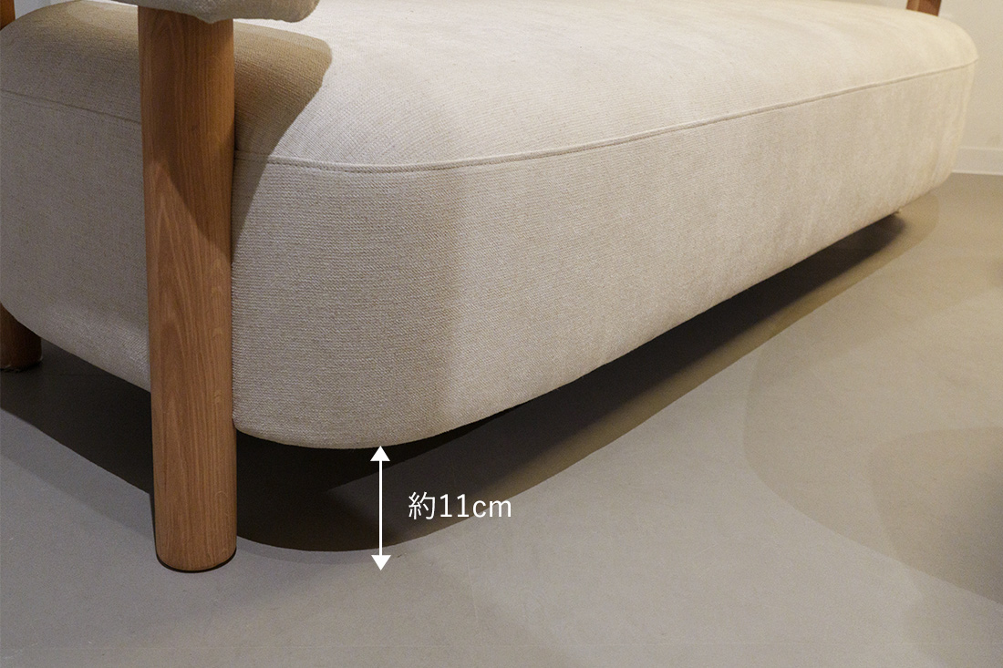 ピュアオークの脚にアイボリー系のやわらかな張地を組み合わせることで、やさしくナチュラルな印象に仕上がります。張地の色を控えめにすることで、クッションやブランケットなどでアクセントを加えやすく、季節や気分に合わせたコーディネートを気軽に楽しめます。