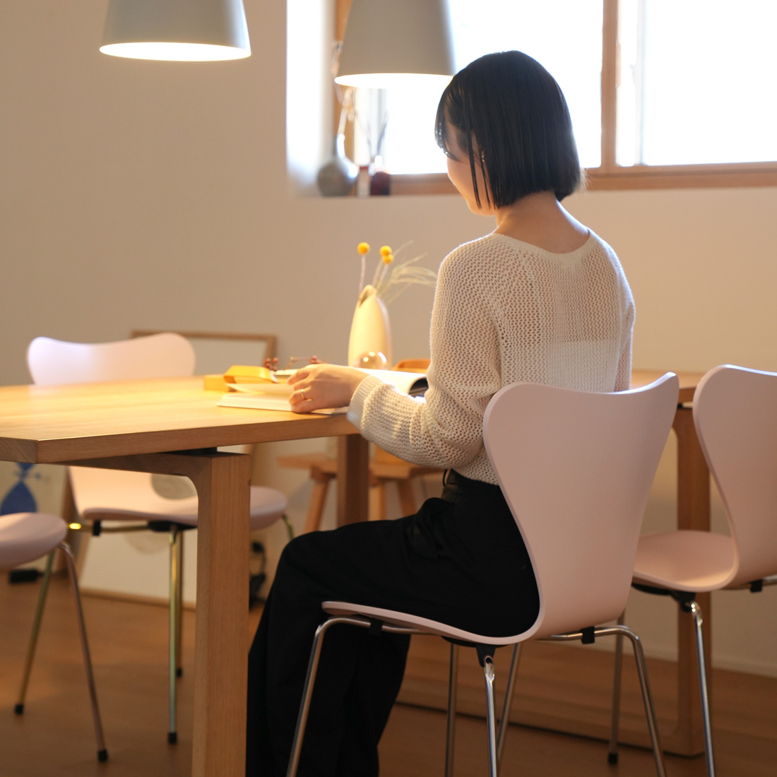 木製の家具と合わせると、やわらかなピンクと木のぬくもりが調和し、空間に穏やかな温かさをもたらします。