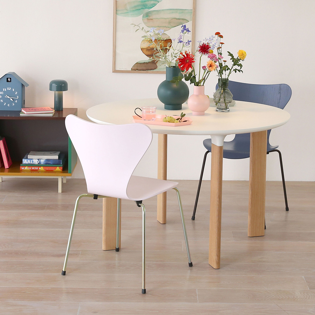 カラフルなインテリアに合わせれば、淡いピンクが軽やかなアクセントとなり、お部屋全体にかわいらしい雰囲気を添えてくれます。ホワイトのテーブルと組み合わせると、色のコントラストによってピンクがより引き立ちます。