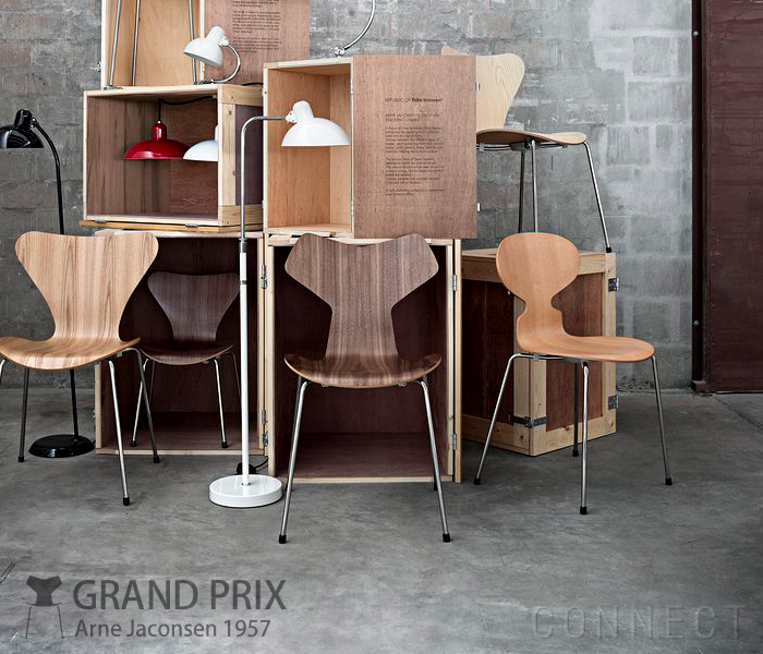 1957年、アルネ・ヤコブセンによるデザインのグランプリチェア(3130モデル)は、 コペンハーゲンのデンマーク工芸博物館の春の展示会で初公開されました。 そして同年のミラノ・トリエンナーレにおいて展覧会のグランプリに輝いたことから 「グランプリ」という名称で呼ばれています。