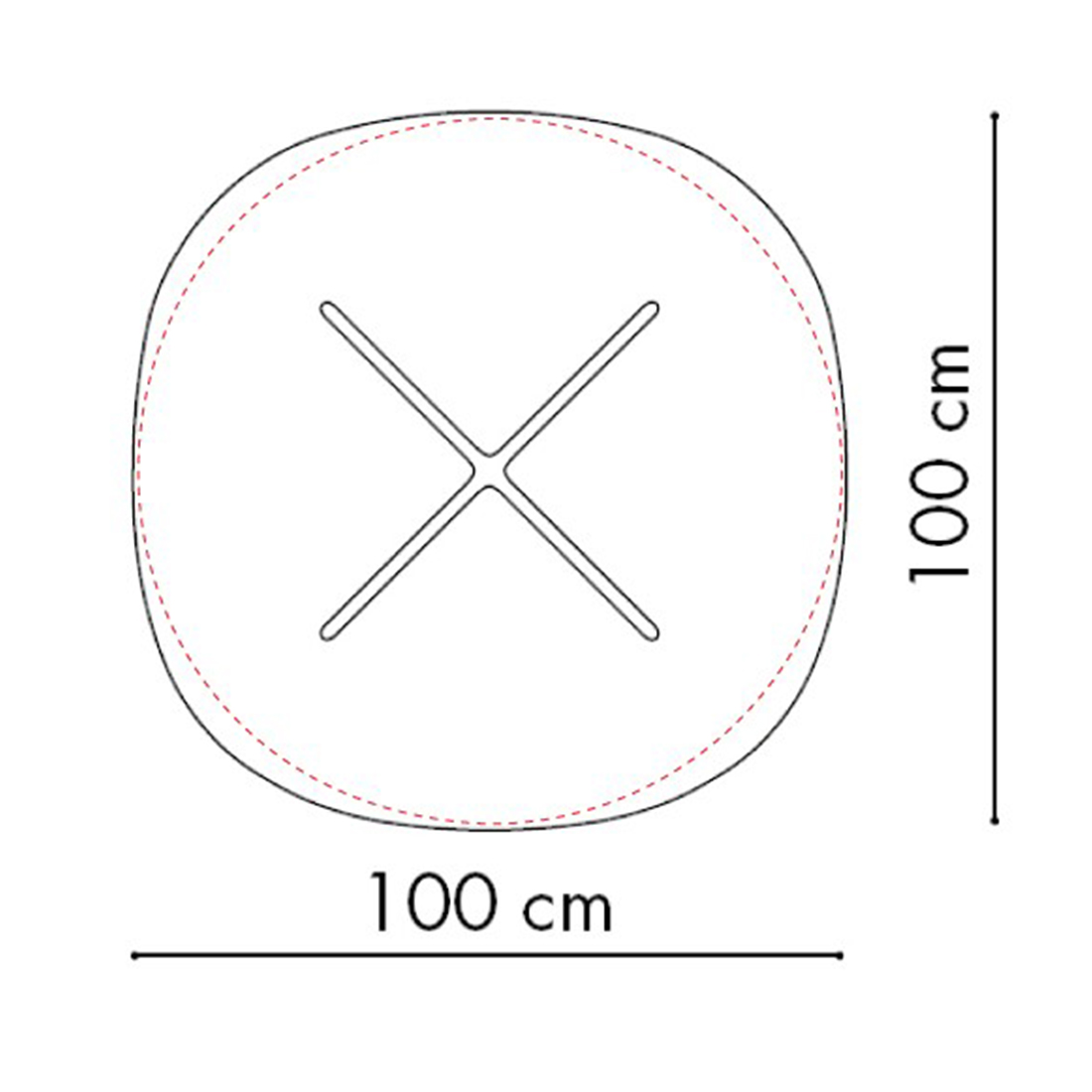 正円ではなく正方形の角を取ったような形になっており、カーブの部分が円(図の赤線)よりも少し膨らんでいます。この数センチのゆとりが意外と大事。手元にカップを置きやすかったり、パソコン作業のときには肘がしっかり置けたり、食事や作業がぐんと快適になるんです。