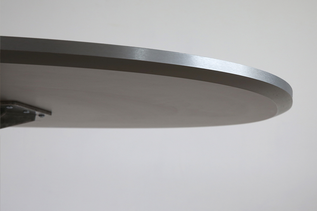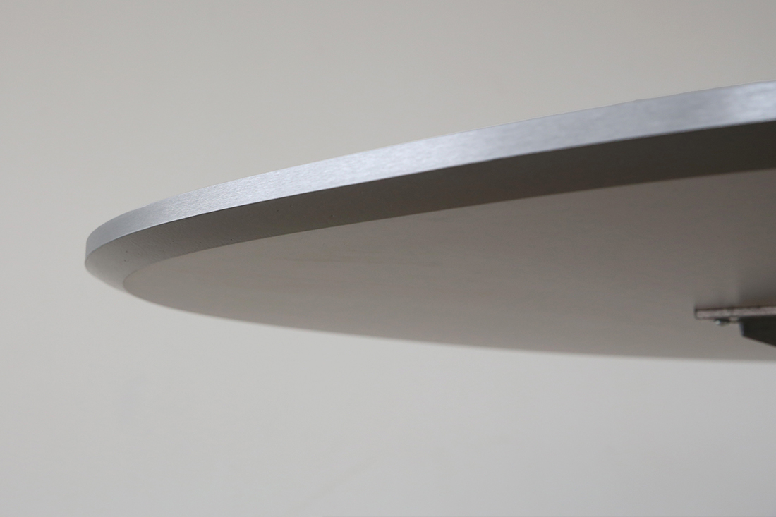 天板の縁にはテーパー加工(斜めにカットする加工)が施されており、実際の厚みは2.2cmですが、見た目上は縁部分の1.3cmしかないように見えます。この絶妙なデザインが、スーパー円テーブルならではのスタイリッシュな印象を生み出します。