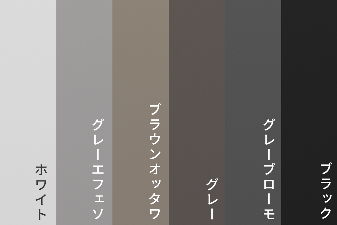 ホワイト・ブラックの他に、ニュアンスちがいのグレーが2色(光沢のない銀色のような「シルバーグレー」と、深めのグレー「ウォームグラファイト」)。加えて、こげ茶に近い色味の「ブラウンブロンズ」があります。