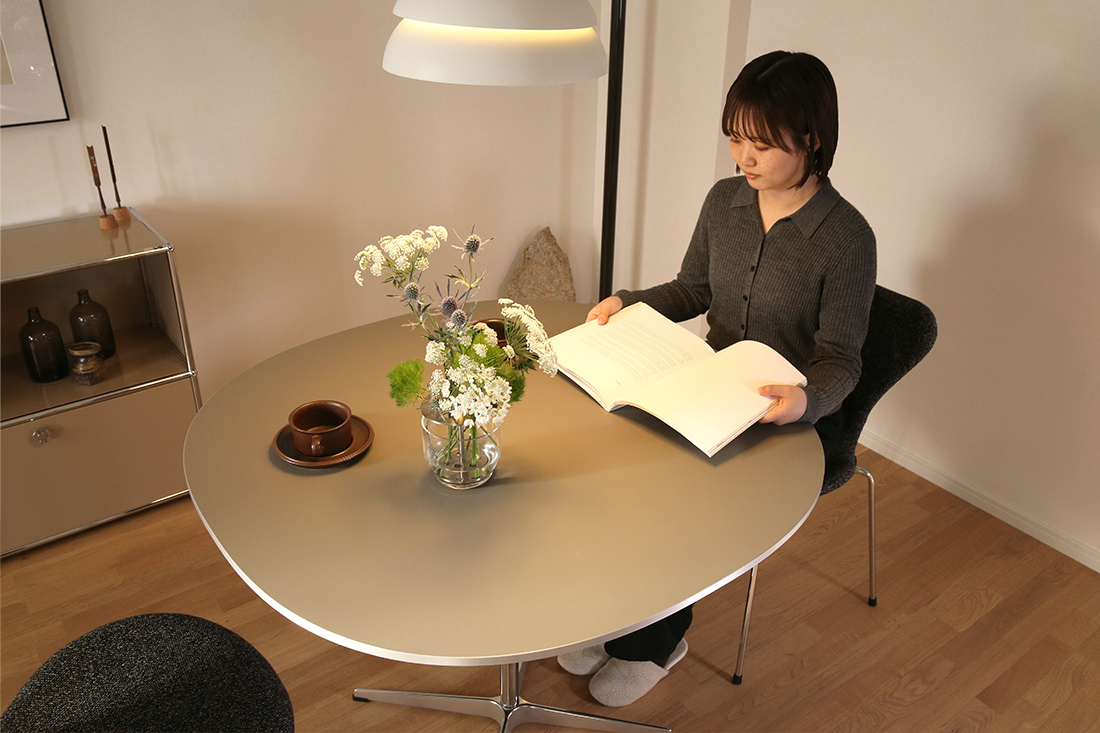 このように、スーパー円テーブルはスタイリッシュでありながら冷たさを感じさせない、上品で柔らかな風合いを持つデザインで、木製家具や木のフローリングとの相性も抜群。
