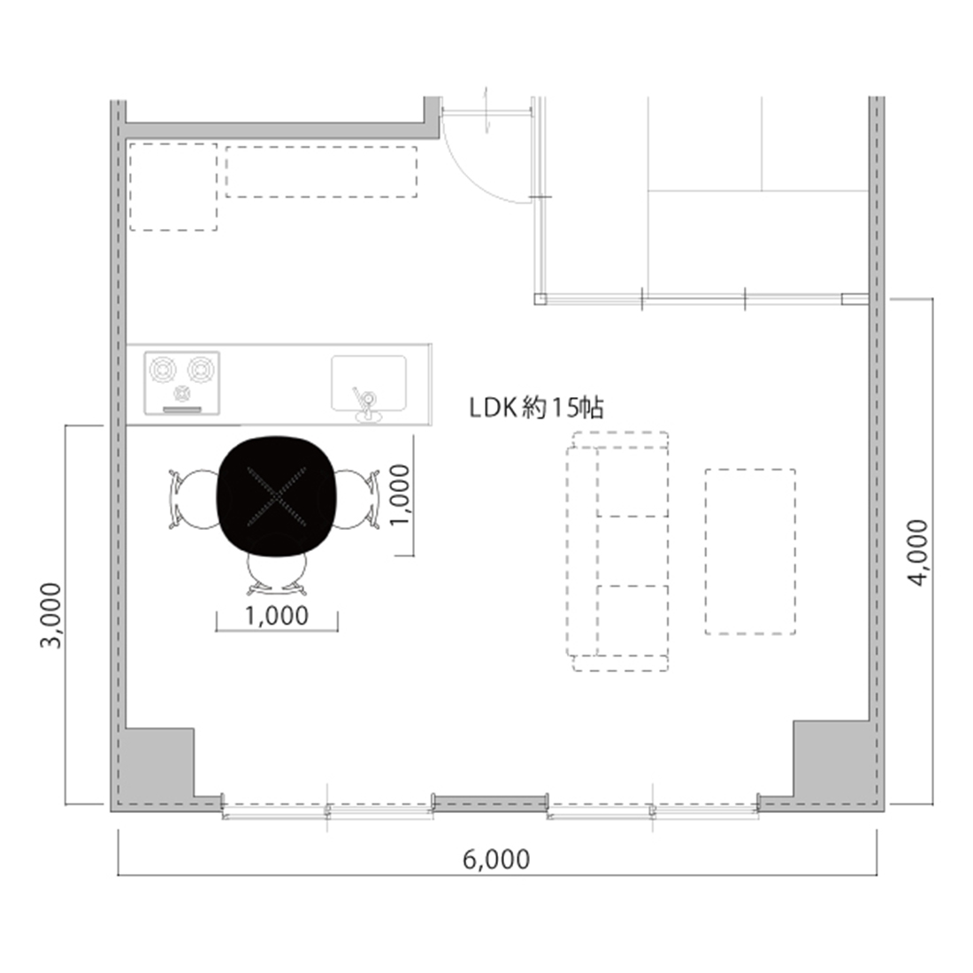 普段は上の図のように3人掛け、来客時には壁から離して4~5人で囲むなど柔軟な対応ができるのも嬉しいですね。