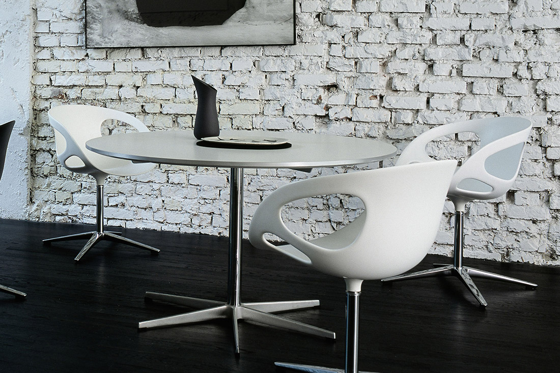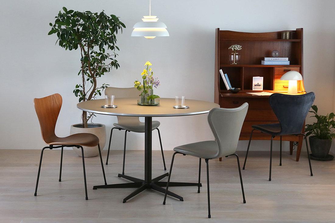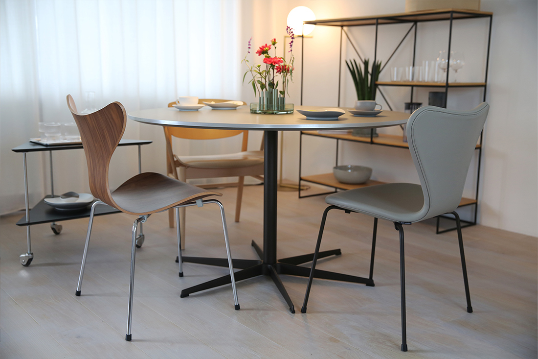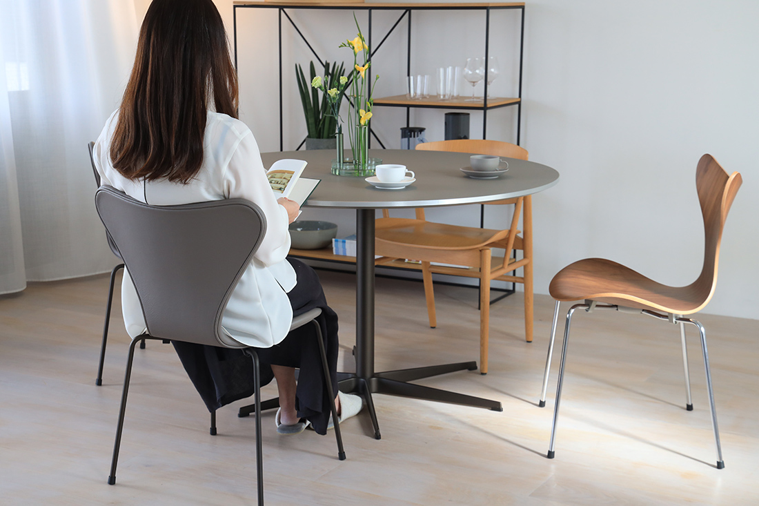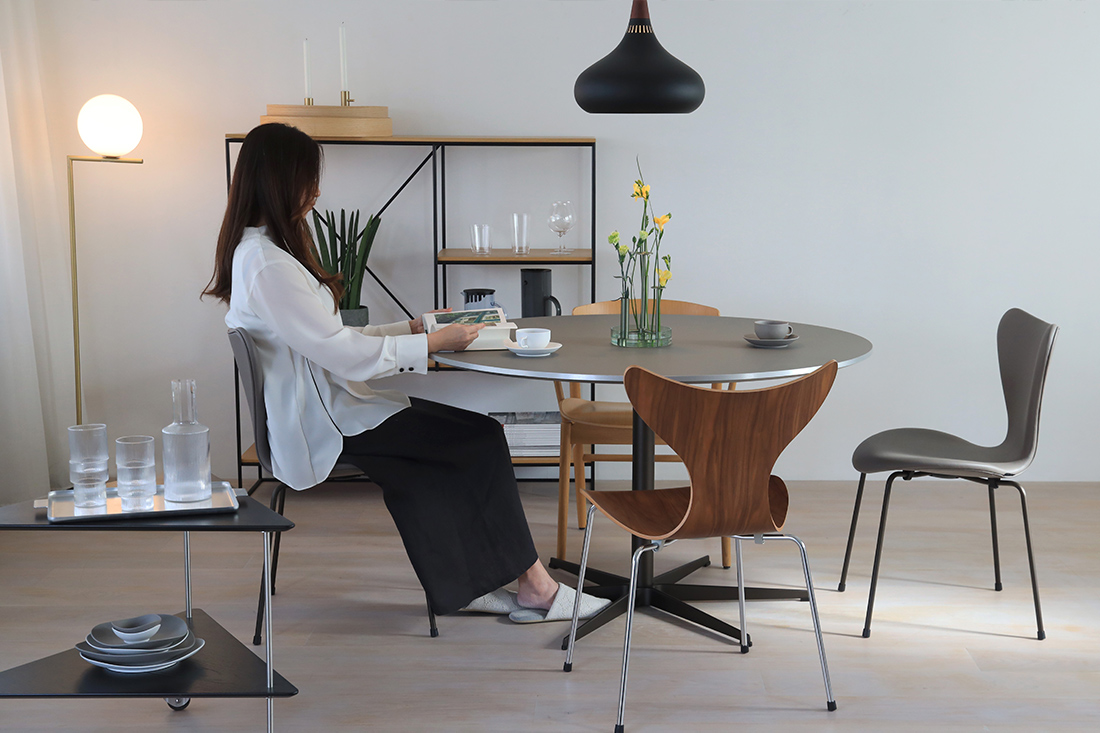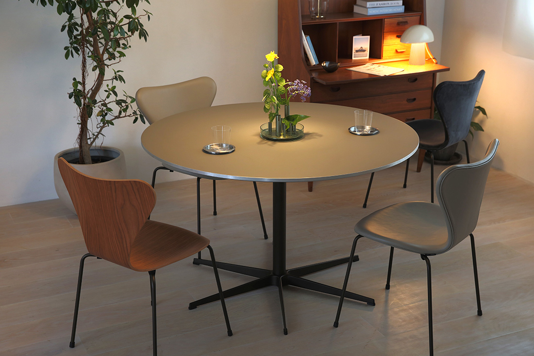 座る場所を選ばない自由。アルネ・ヤコブセンのスターベースが叶える、軽やかな円テーブル