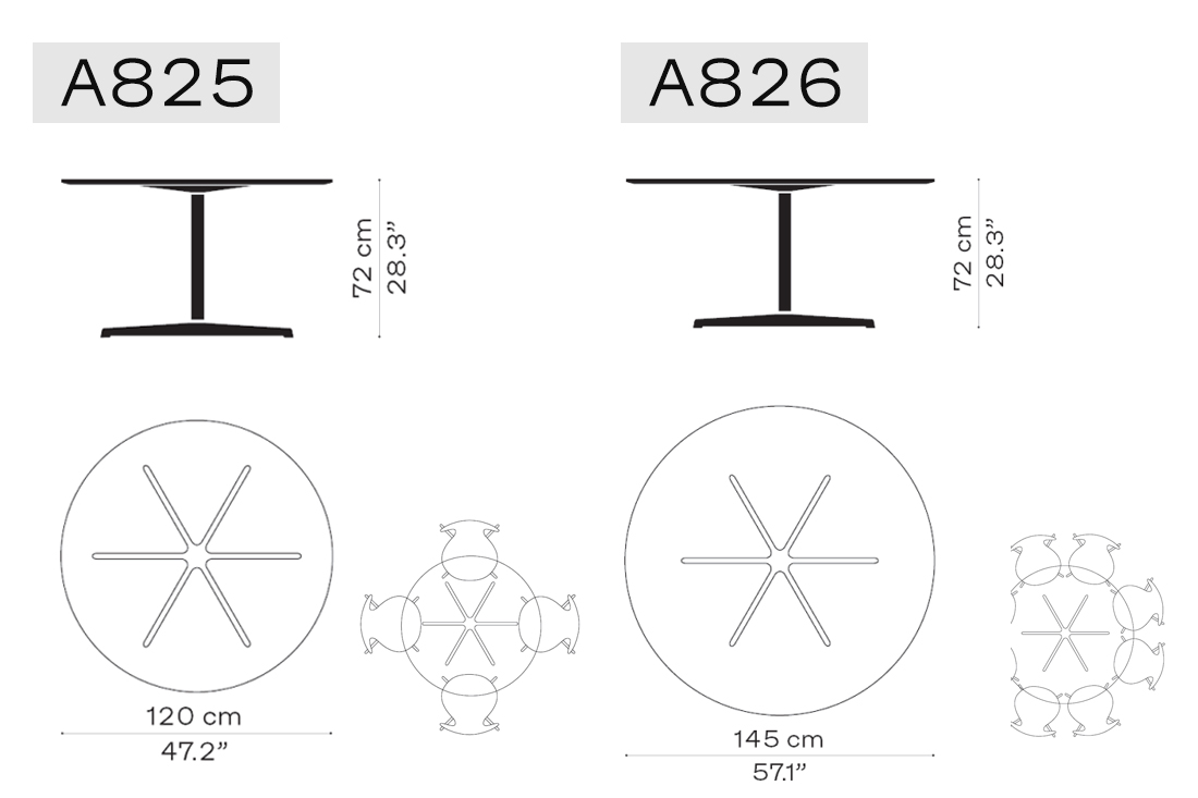 直径120cmのA825は、4人がゆったりと座れる、余裕のあるサイズ。