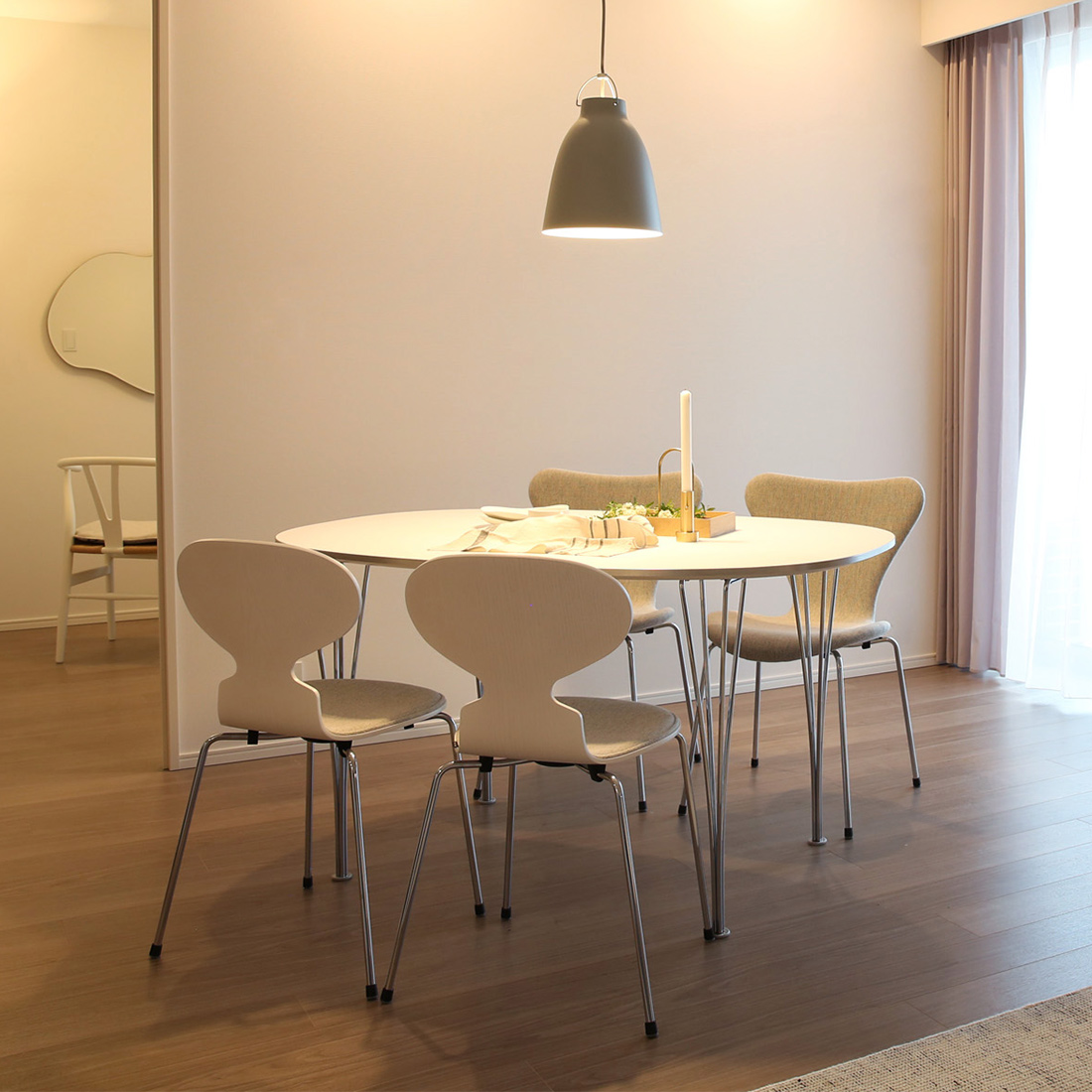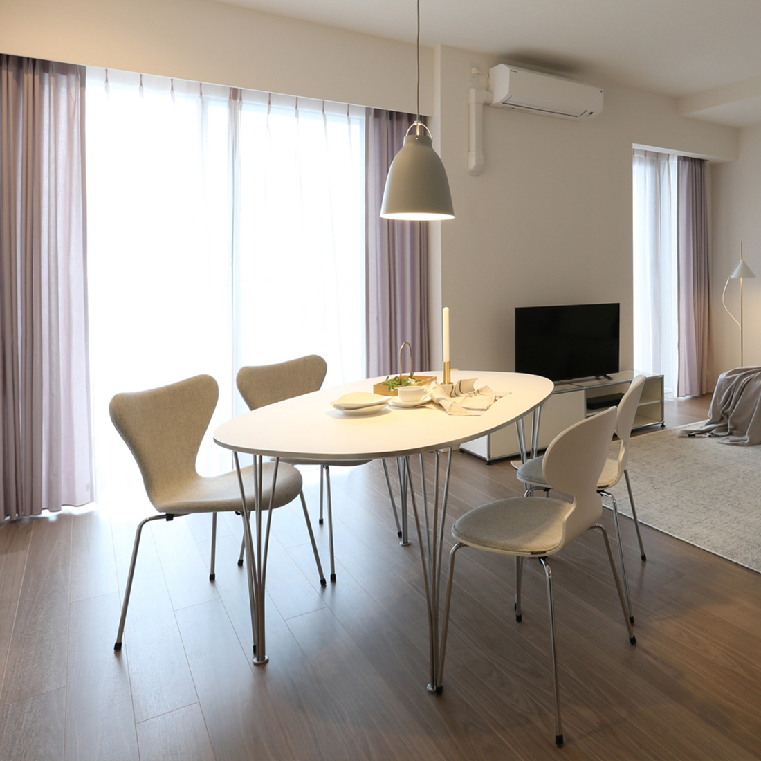 チェアとのコーディネートでは、グレーやホワイトの張地を用いたセブンチェアやアリンコチェアを合わせると、気品あふれる空気感を演出できます。