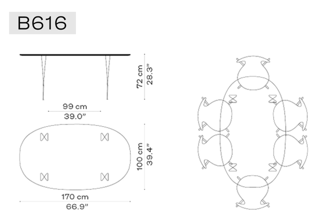 「B612」と比べ、「B616」モデルはチェアの座面部分が入る高さの脚間が約104cmと、チェアどうしの間隔にゆとりを持たせることができ、ゆったりとくつろげる設計です。横並びに座り、食事をすることを想定されている方には特におすすめしたいサイズです。