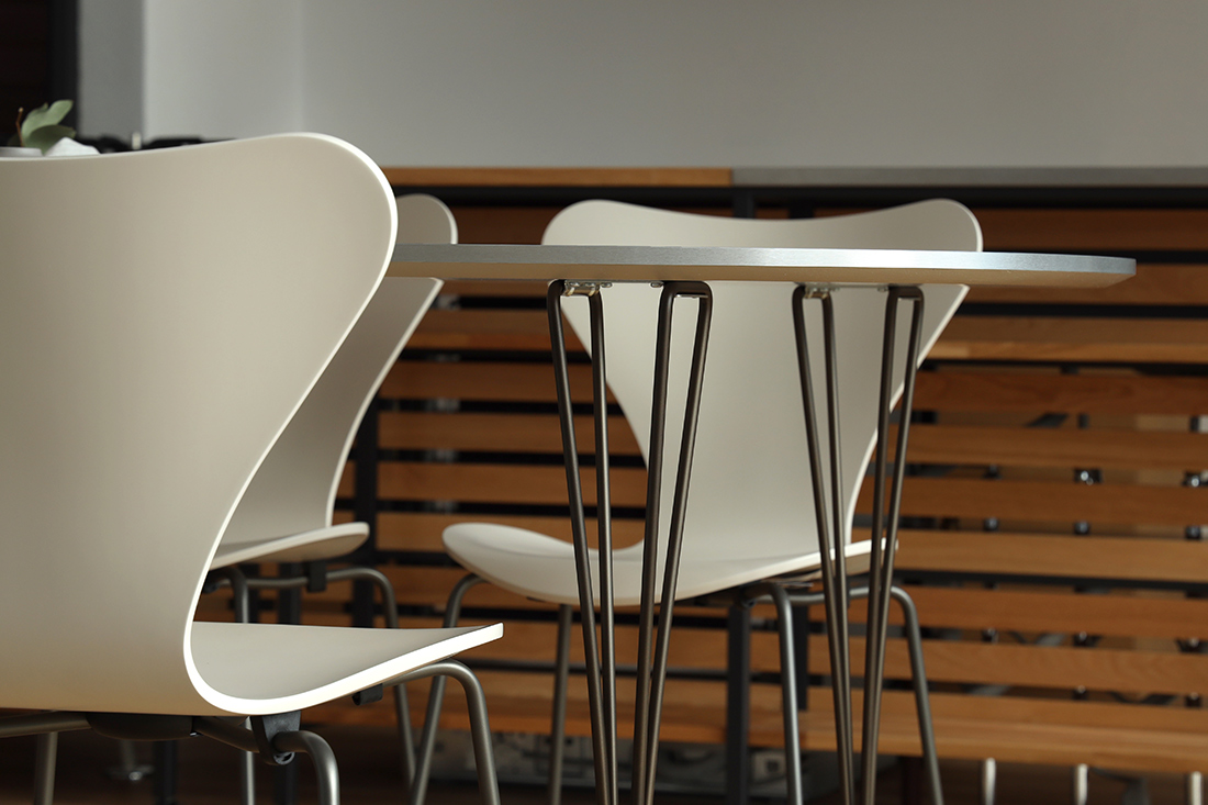 一本脚テーブルの「A603」や「A602」の「A」はアルネ・ヤコブセンの頭文字です。