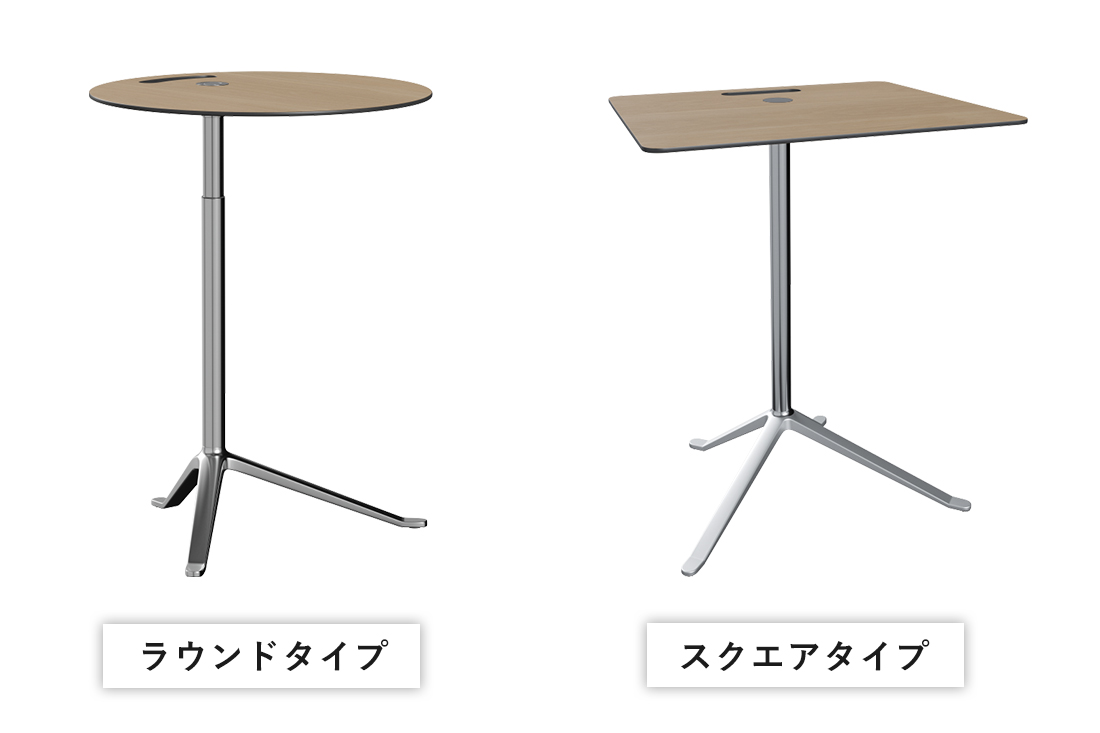 丸みのあるラウンド型はやさしく柔らかな印象に。直線的なスクエア型は、すっきりとモダンな空間におすすめ。どちらも、ノートパソコンやカップ、本を置くのにちょうど良いサイズ感です。