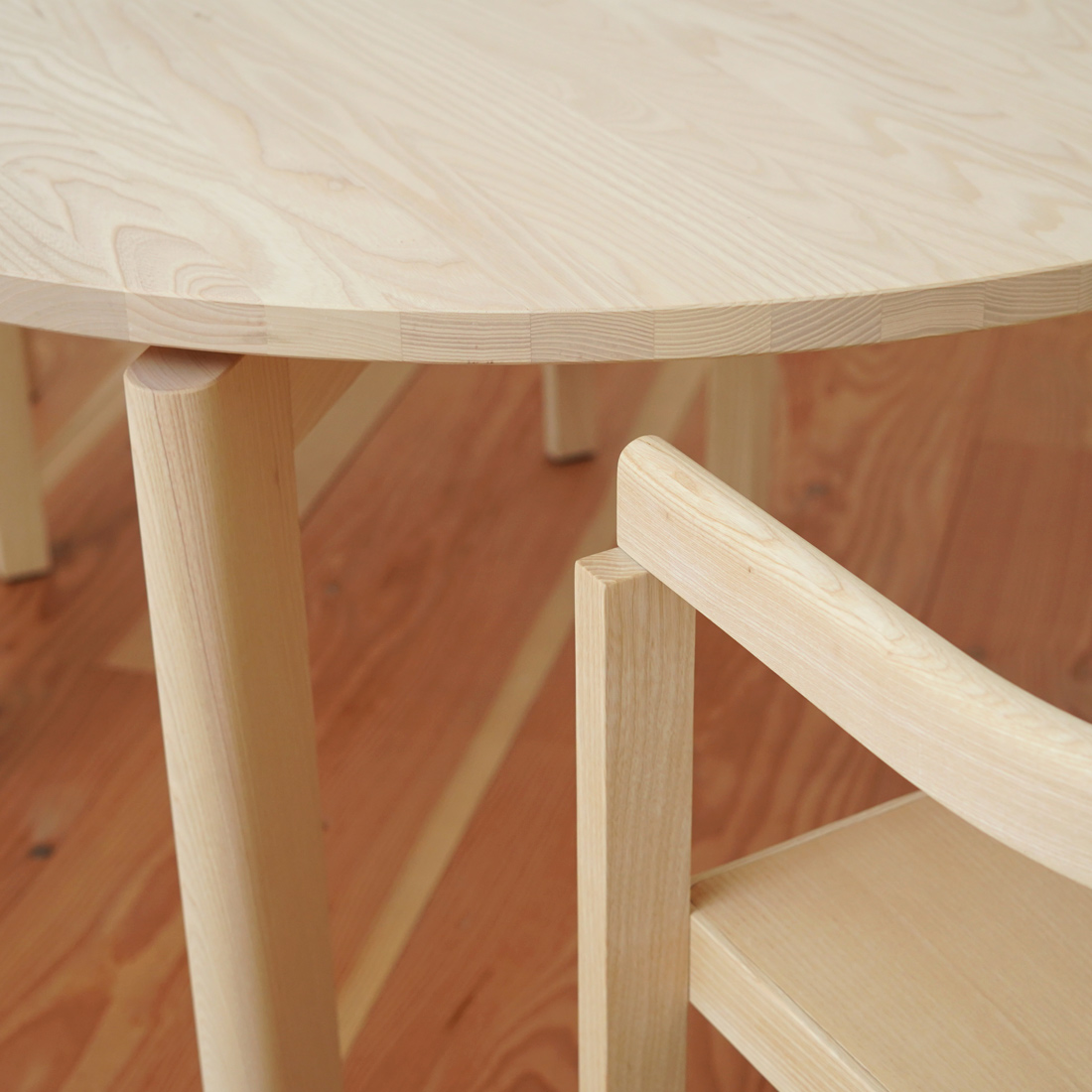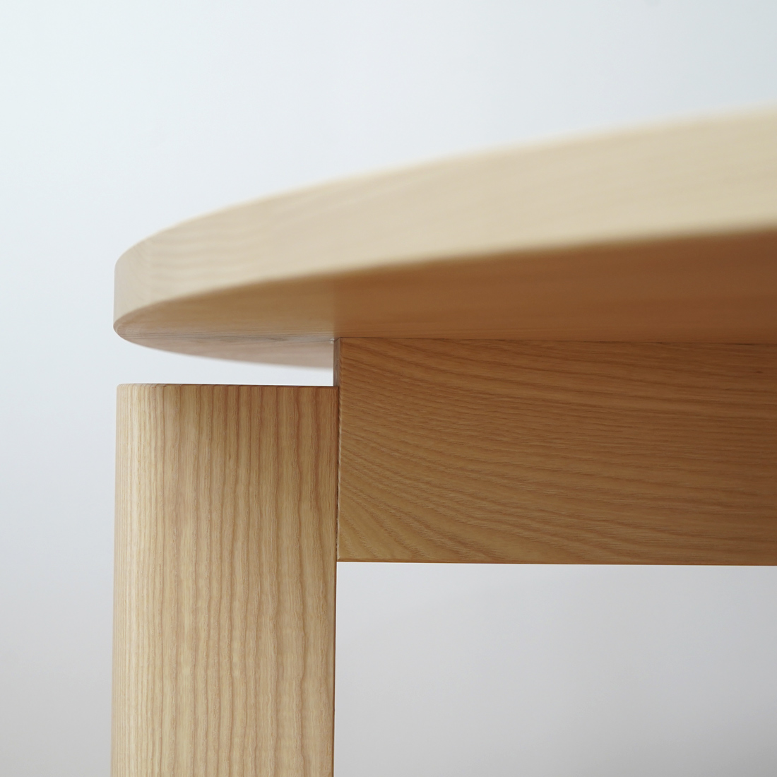 光を受けた天板には、アッシュ特有のまっすぐで美しい木目が浮かび上がります。素材の清潔感と明るさが際立ち、空間全体にさわやかな印象をもたらします。