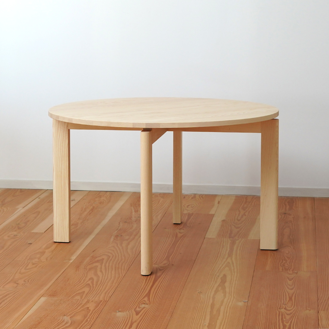 一人で過ごす静かな時間は、手元に広がる無垢材の余白が、そのまま心地よい開放感に。二人でテーブルを囲むときは、円形ならではの角のない構造が、自然と会話を中心に導いてくれます。直径120cmは、大人4人が無理なく座れるサイズ設計。