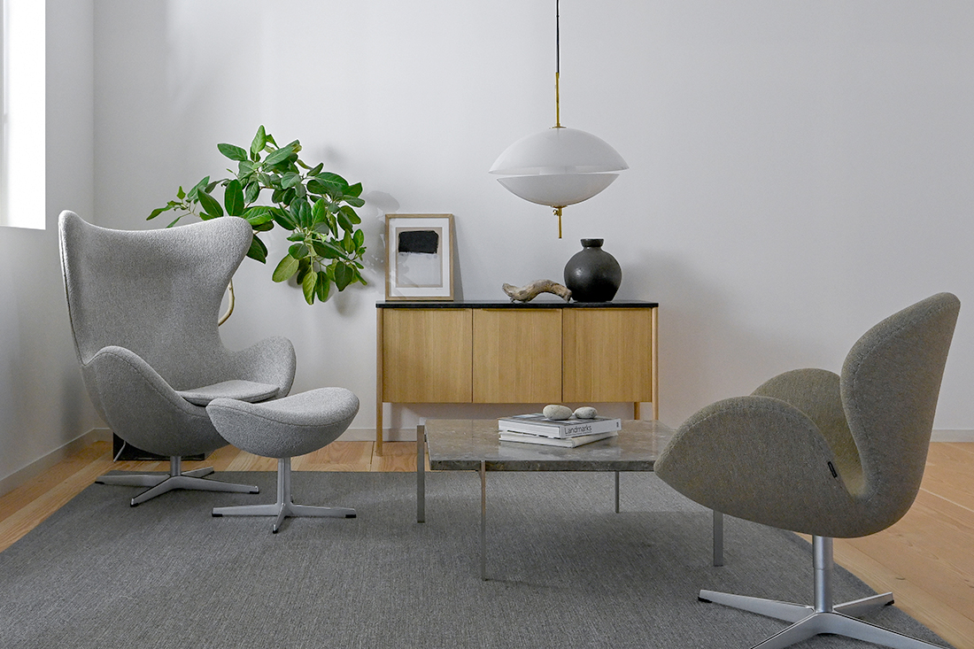 ▲左からEGGチェア(ラウンジチェア)Jut Cabinet(キャビネット)PK61(ローテーブル)CLAM(ペンダントライト)SWANチェア(ラウンジチェア)
