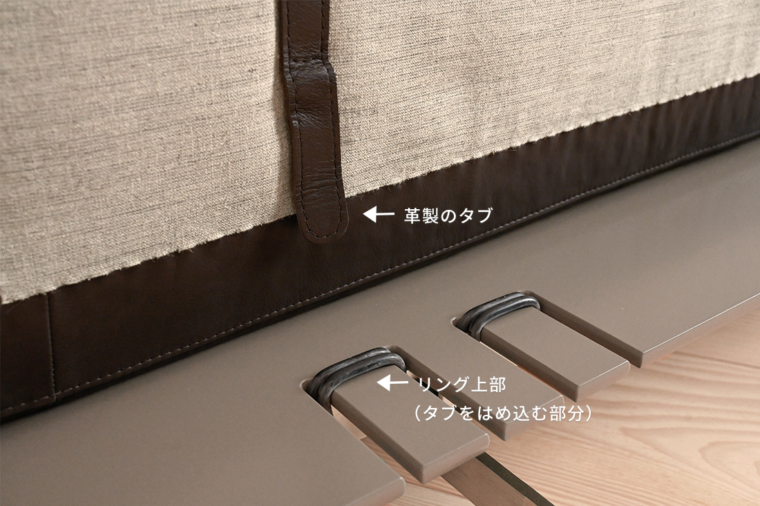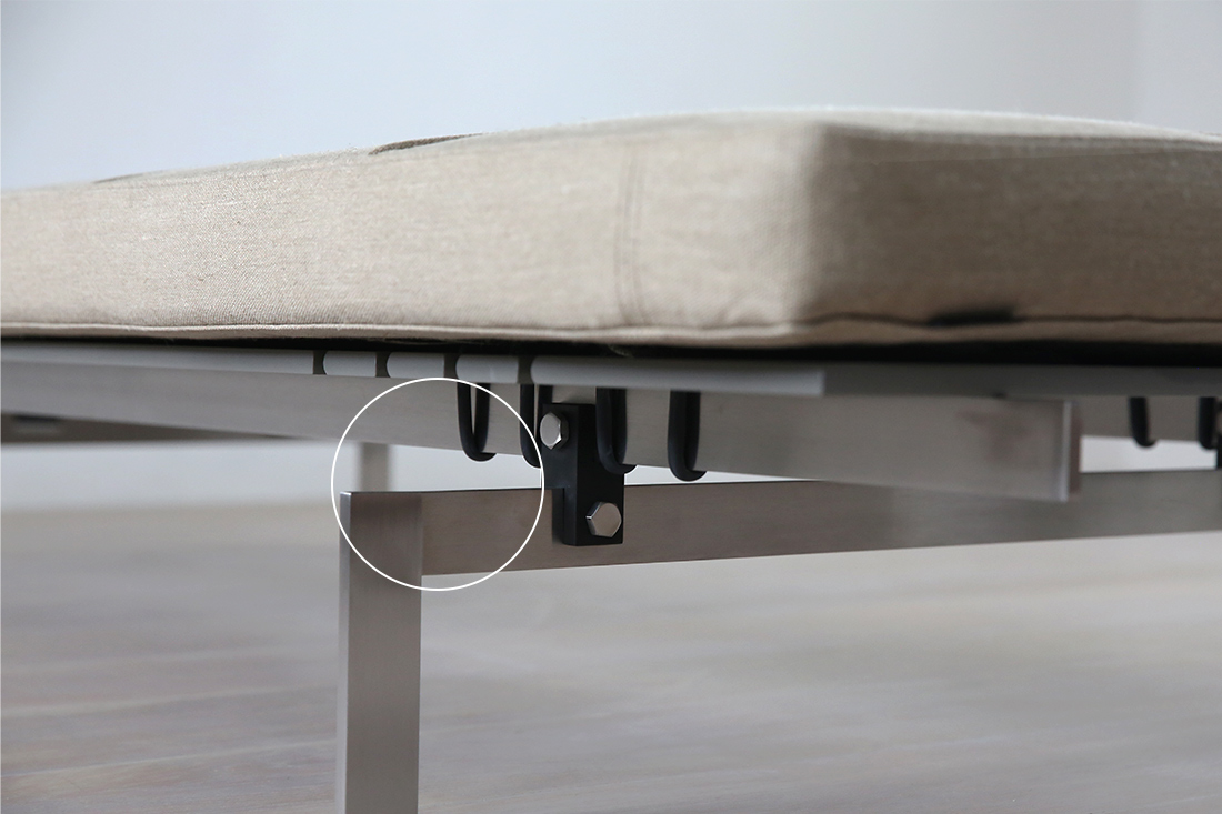 ステンレスのフレームと台座の合板はゴム製のOリングでつながれ、リング上部に革製のタブを差し込んでマットレスが固定されています。