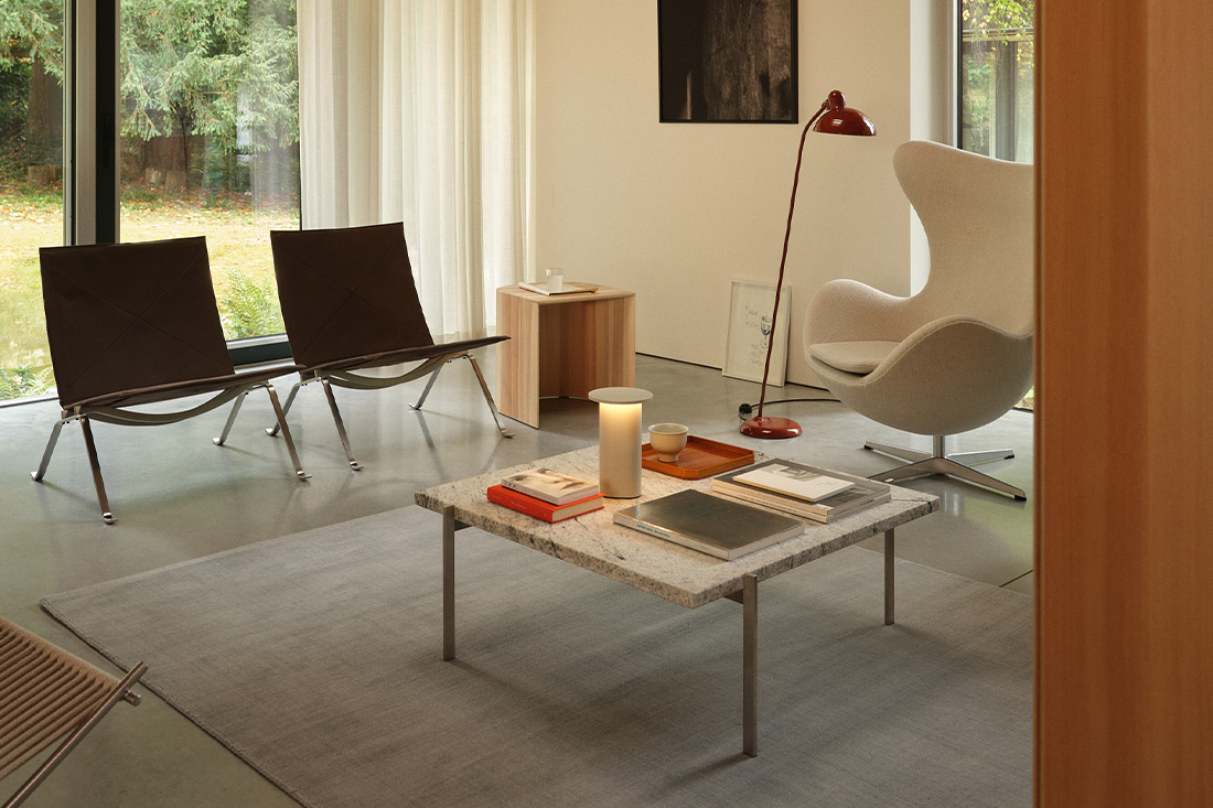 ▲左からEGGチェア(ラウンジチェア)・Jut Cabinet(キャビネット)・PK61(ローテーブル)・CLAM(ペンダントライト)・SWANチェア(ラウンジチェア)