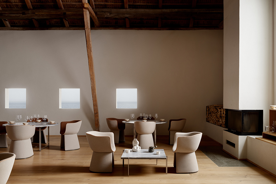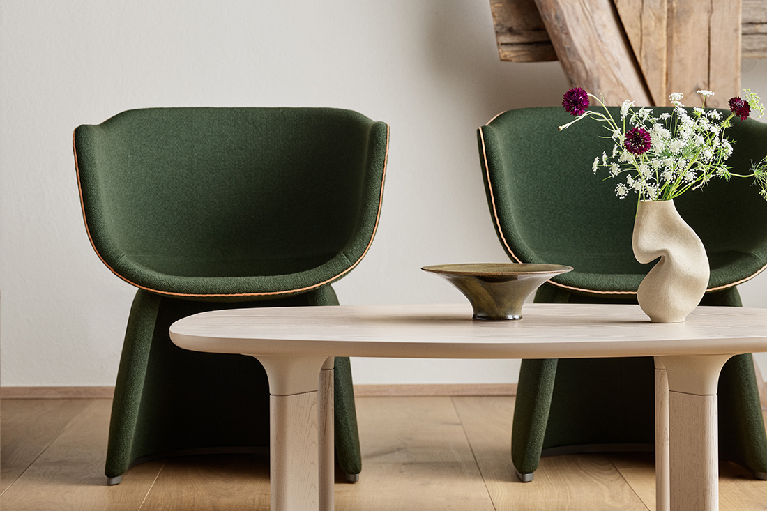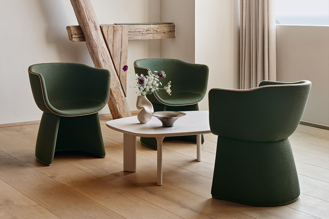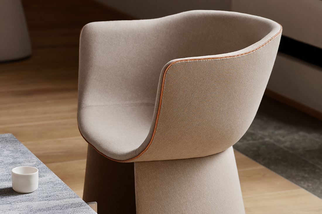 座る人を優しく包み込むようなで、安心感と親密さが感じられます。オーガニックな曲線と安心感をもたらしてくれる形がパーソナルなスペースを生み出し、ベースの中に設けられたスペースには、身の回り品が収納できます。