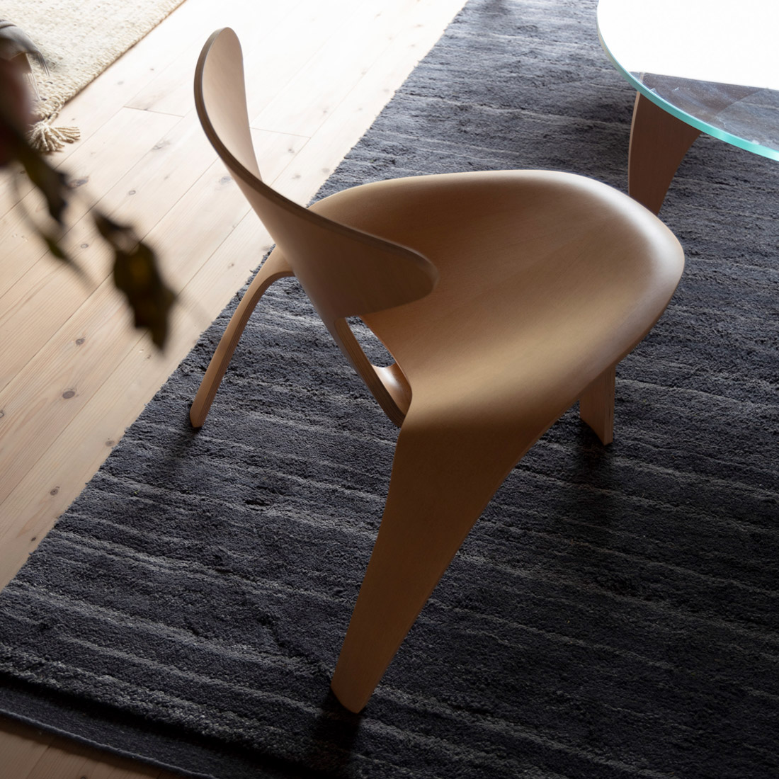 座面に傾斜がついているので、吸い込まれるように体にフィットし、心地良い座り心地の一脚。体をすっぽり包む立体的な形がほどよく体を包み込み、木の椅子とは思えない程よい「しなり」があります。一見複雑そうな形ですが二つのパーツからできているシンプルな構造で、三本のしっかりとした脚に支えられて、安心感があります。