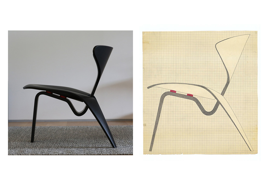 2枚の成形合板の接合部分は、ポール・ケアホルムの当初のデザイン画では赤色で描かれていました。