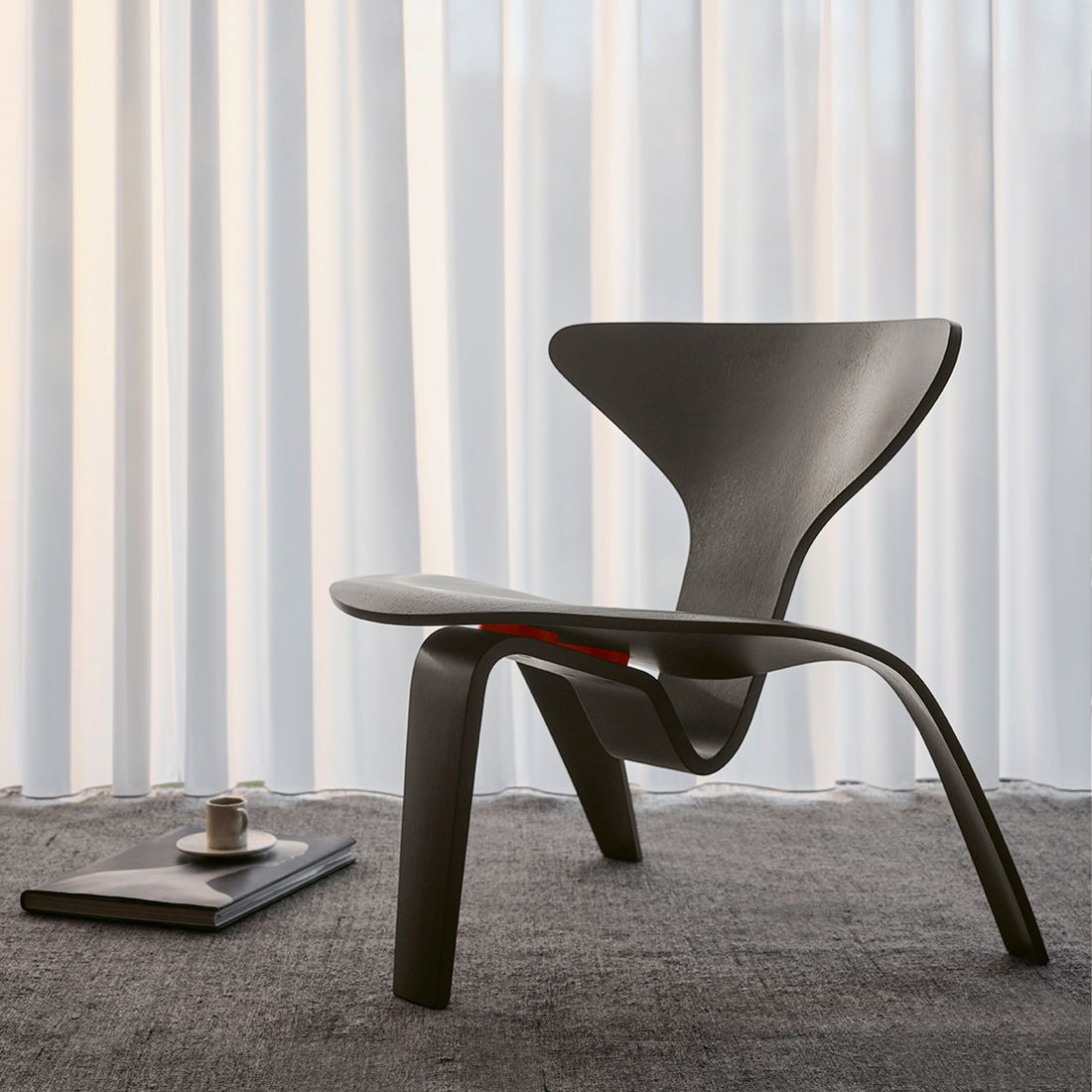 今回の復刻では、ラウンジチェアPK0に強度を持たせた『PK0 A』として販売されます。ポール・ケアホルムの作品には、代表作のラウンジチェアPK22のようにステンレスを用いた直線が美しいものが多いです。しかし、復刻したラウンジチェアPK0 Aは、彼の作品の中で唯一、成形合板の技術が使われています。