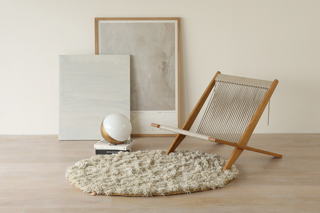 オーレグラスとは、デンマーク語で“アマモ”を意味します。 パイルの高さが3種類で構成されており、海の中で揺れる海草のような生き生きとしたテクスチュアが特徴です。自然の複雑な造形美からインスピレーションを得たこのラグは、ブークレ糸によって縁取られたボーダーによってユニークなコントラストが添えられることで、ダイナミックな立体感とエレガンスを生み出しています。