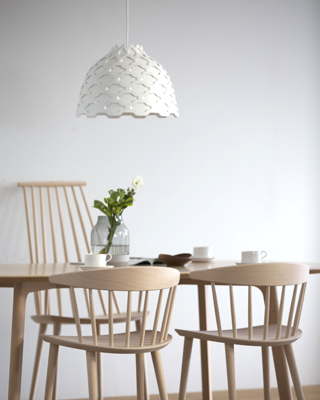 眩しい光で視界を邪魔せずにテーブルや天井を照らすことは、基本条件です。さらに、型押しした隙間から光を部屋に拡げ、同時に、 無数の小さなソフトな光源によってランプ自体が照らされ、浮かびあがるような効果を考えました。LCシャッターズの開発は、 「デンマーク、ヴェイエンにあるルイスポールセン工場内で全製造工程が可能な、新しいペンダントを」という考えで始まりました。