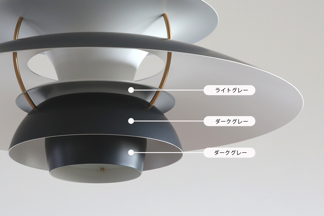 食卓に座ったとき、目に入ってくるリフレクター(下から3枚目の反射板のこと)のカラーはライトグレーに。定番カラーラインナップのPH 5とは対照的に、ここには敢えてポイントを持たせないようにしました。