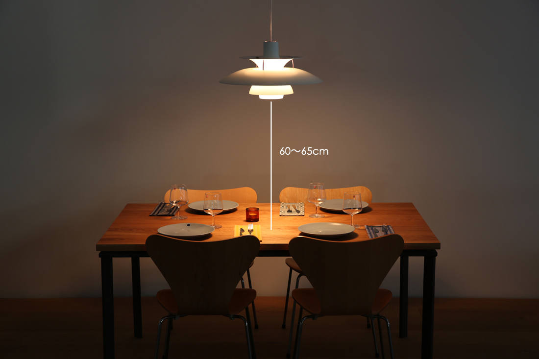ダイニングテーブルの上に吊るす場合、テーブル面からPH 5の下までの高さは60~65cmがおすすめです。