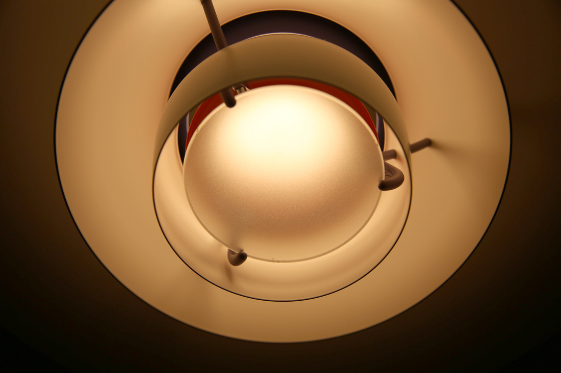 電球の眩しい光を巧みに隠しながら効率的に光を広げるPH 5。電球から放たれた光は、それぞれのシェードに反射しながらやわらかく広がっていきます。