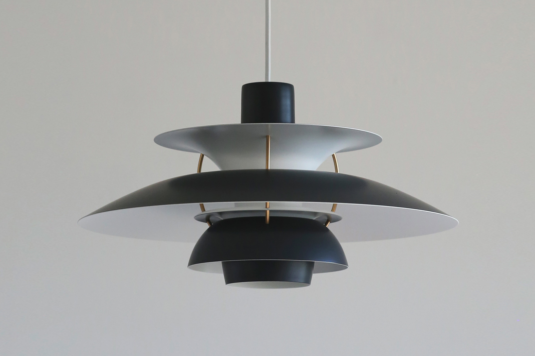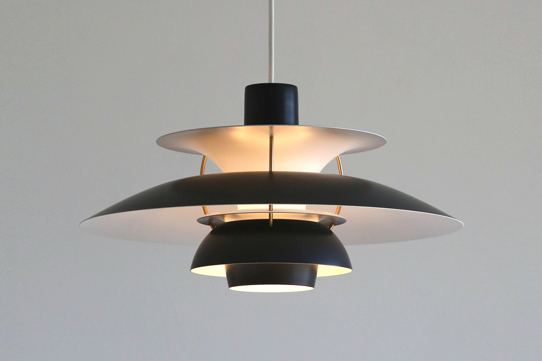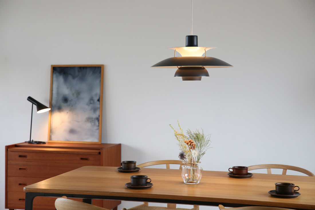 「PH 5(ピーエイチファイブ)」は、照明デザイナーのポール・ヘニングセンによって、1958年に作られました。どこから見ても電球の眩しい光が直接目に入らない、明るいのに眩しくない光の広がりと、その美しいデザインで60年以上経った今でも世界中で愛されている名作照明です。