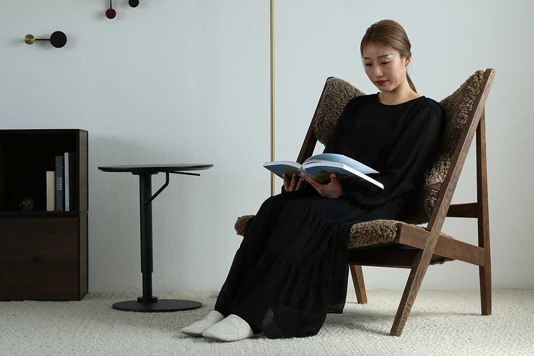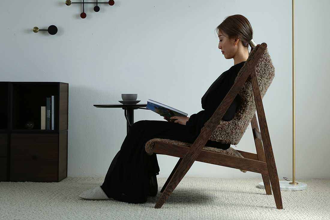 座面の高さは30cmと低めに設計されています。背もたれにかけてゆるやかに傾斜しているため、自然と身体を預けたくなる、心地よいリラックス姿勢を叶えます。読書や映画鑑賞、ちょっと一息つきたいときにも寄り添ってくれる、上質なひとときのための一脚です。