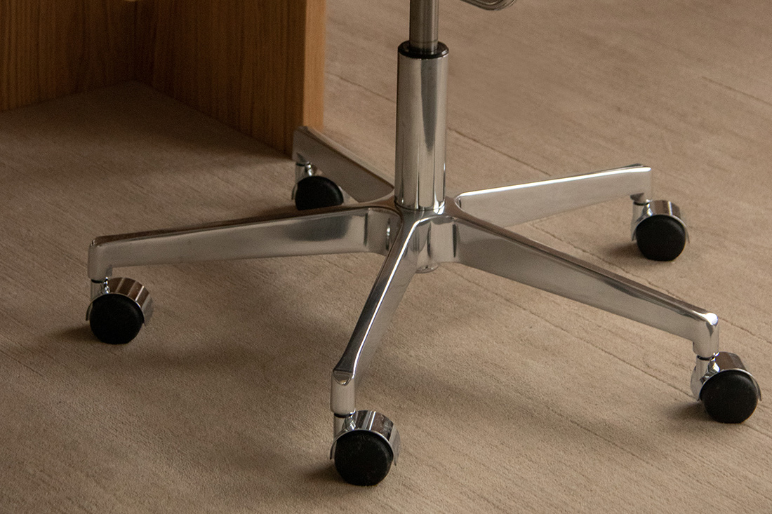 5本脚のキャスターは動きがとても滑らか。デスク周りでのちょっとした移動もストレスフリーです。 荷重がかかっていない時はキャスターにロックがかかり、座ると解除される安全設計も魅力のひとつです。