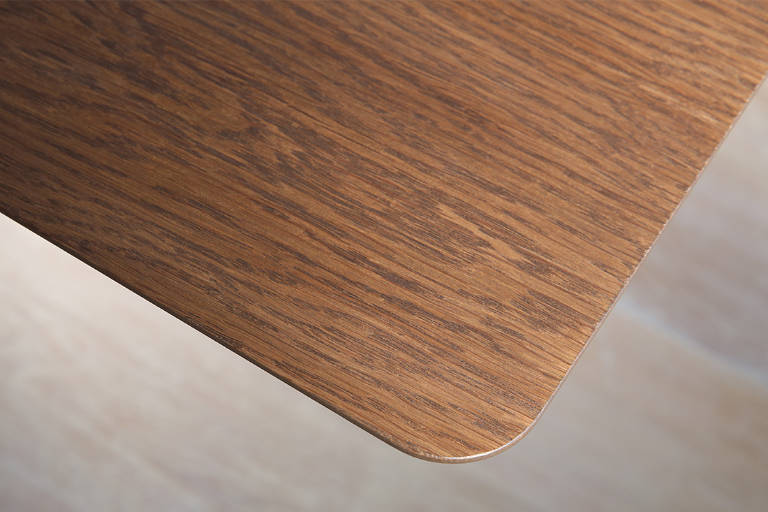 天板にはオーク突板(オークベニヤ)を使用し、ウレタン塗装で仕上げています。無垢材のような豊かな風合いでありながら、反りや割れが起こりにくく、お手入れも簡単。軽量で扱いやすく、日常使いに最適な素材です。