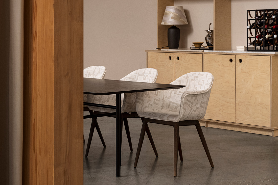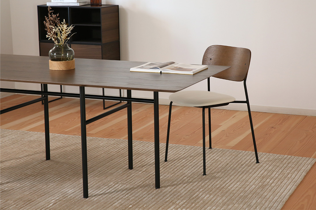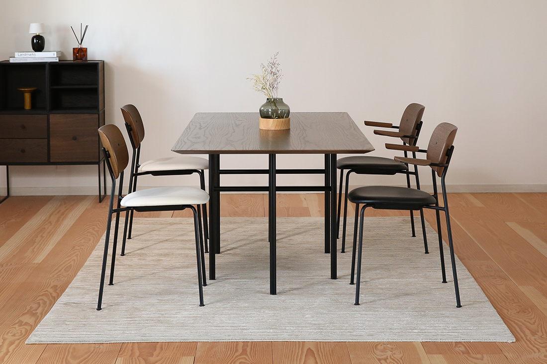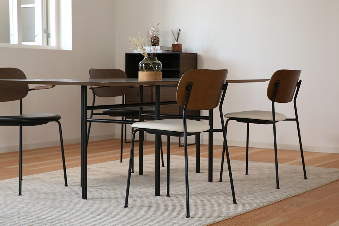 同じブラック脚のCo Dining Chair(コ ダイニングチェア)を合わせれば、統一感のあるすっきりとした印象に。静かで美しい空間が、毎日の食卓をやさしく包み込みます。