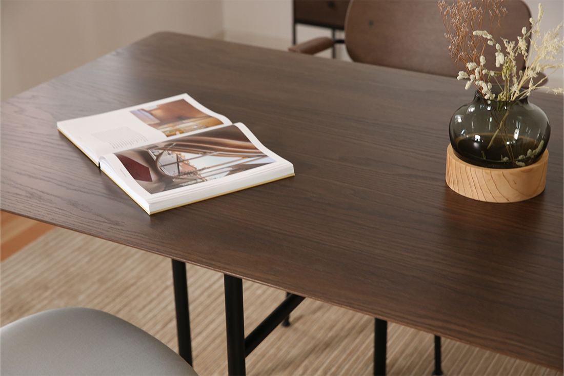 Dark Stained Oakの天板は、モダンにもナチュラルにもなじみやすく、幅広い空間に調和します。落ち着いたトーンと洗練されたフォルムがつくる上質な佇まいに、無駄のないシンプルなデザインが軽やかさと心地よさを添えます。