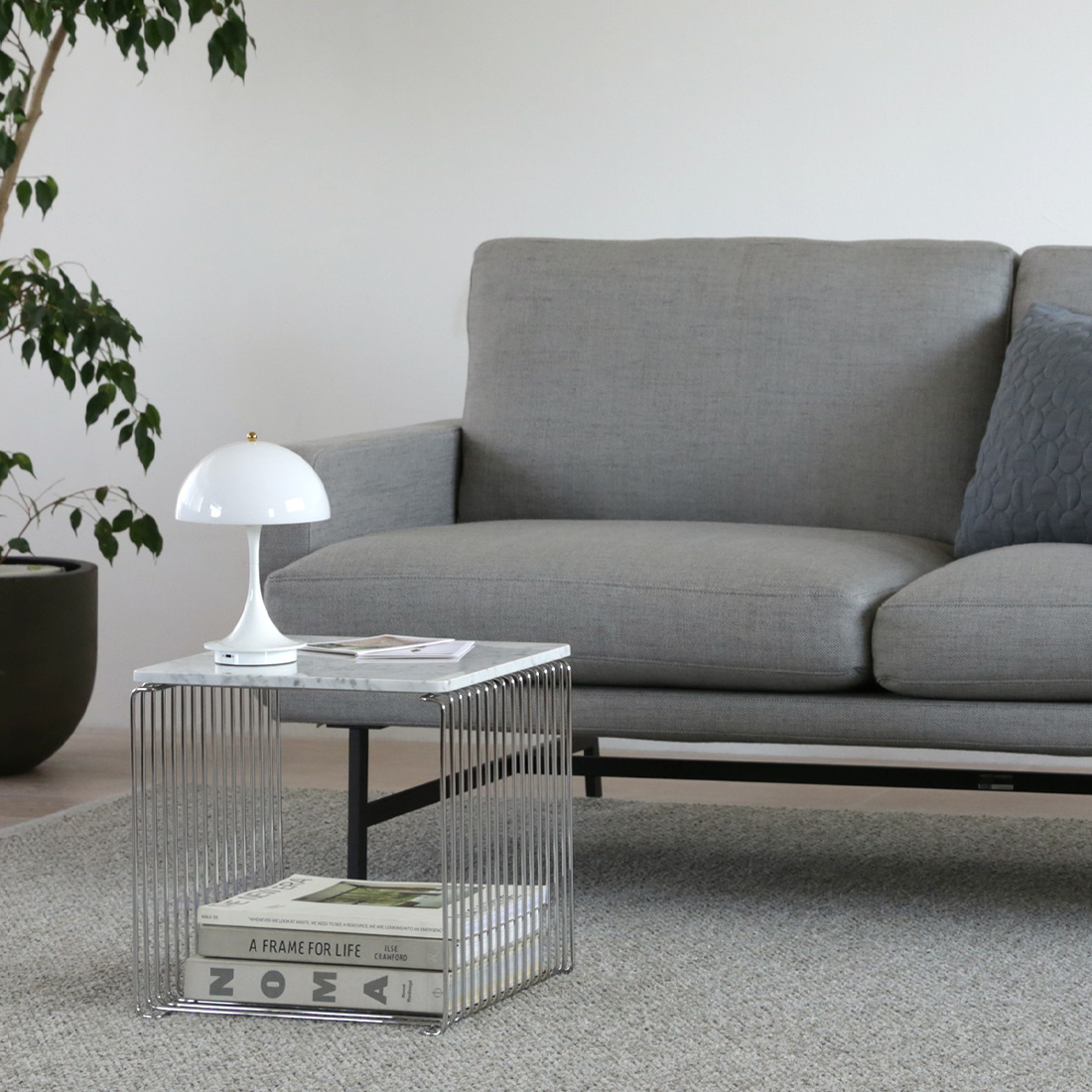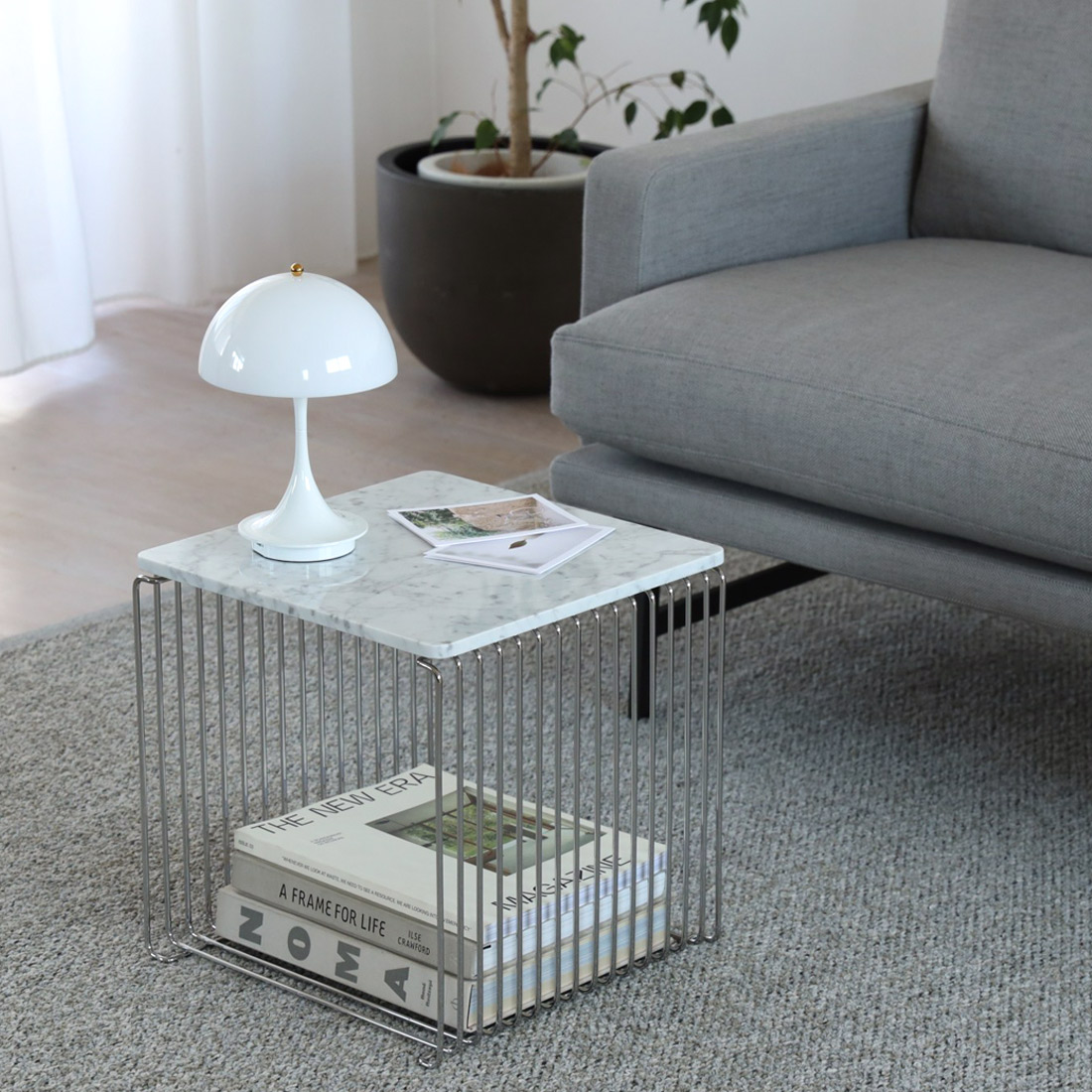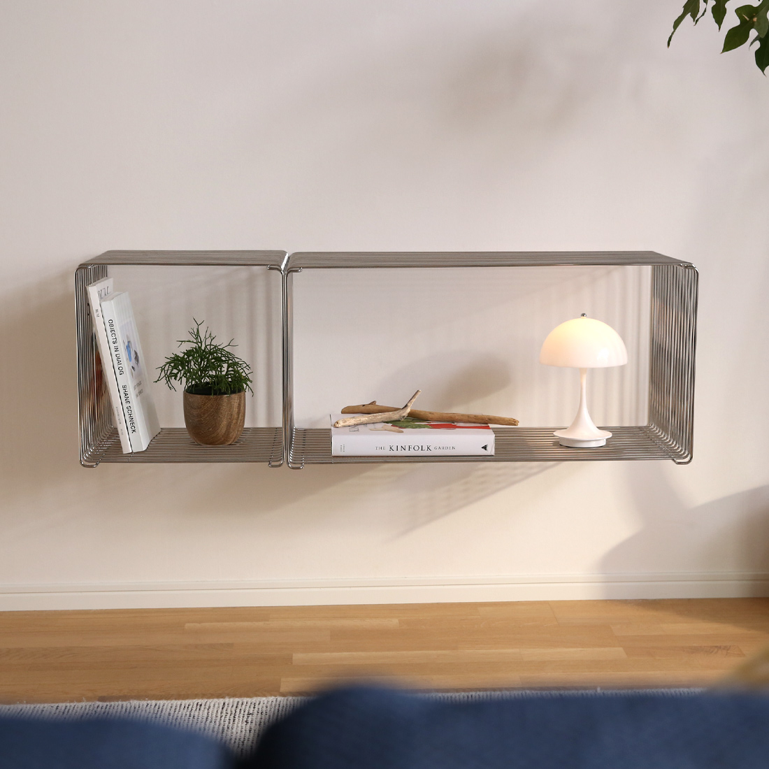 パントンワイヤーの最大の特徴は、その“抜け感”です。スチールワイヤーで構成された繊細なフレームは、視線を遮らず、空間に余白とリズムを生み出します。家具としての機能を保ちながら、視覚的には軽やか。壁まわりや狭いスペースでも圧迫感なく、空間全体がすっきりと広く見える効果があります。