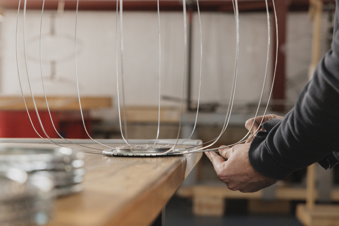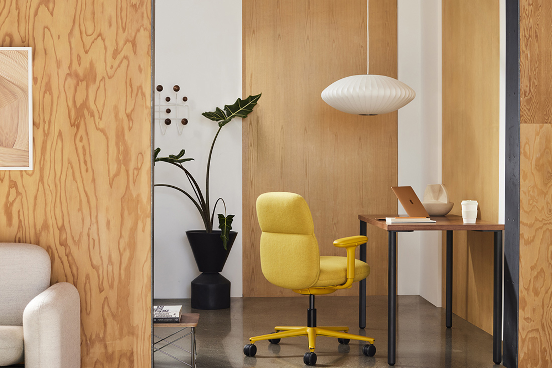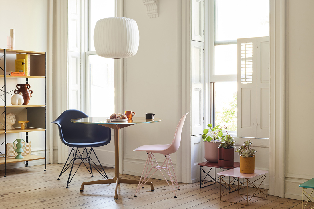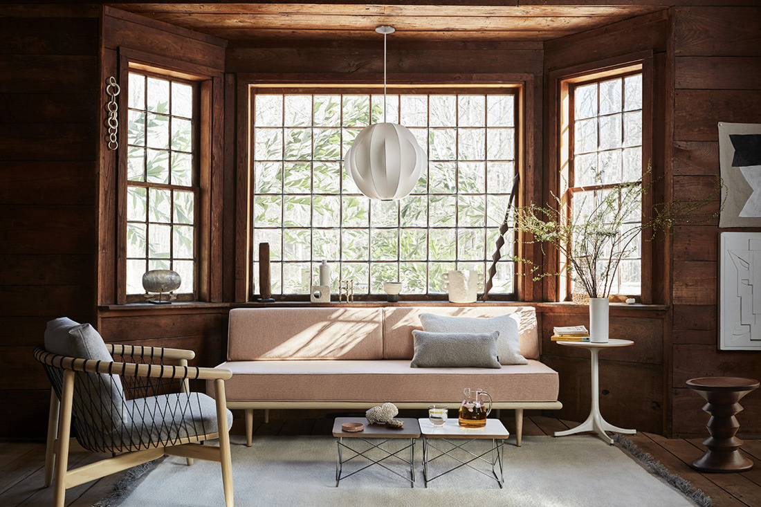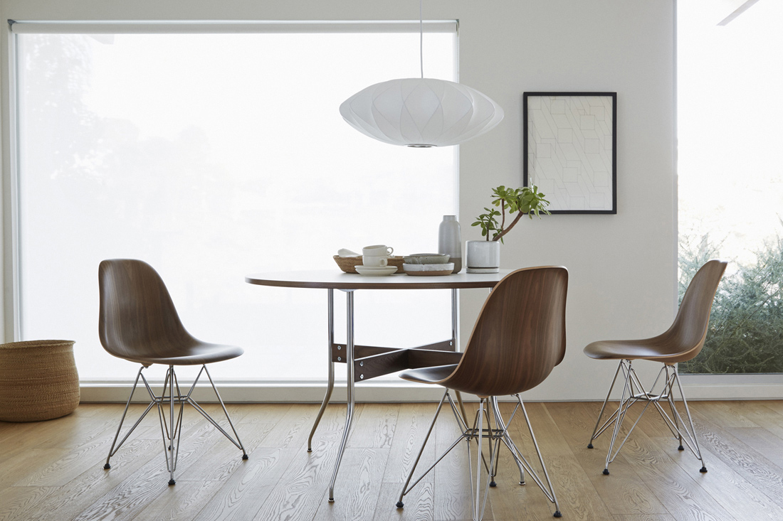 1952年、ジョージ・ネルソンがデザインした「バブルランプ」は、ハーマンミラーを象徴するミッドセンチュリーの名作です。職人が細いスチールフレームに特殊プラスチックをスプレーでコーティングする手法で、シンプルでありながら幻想的な光を放ちます。この工程は今も変わらず受け継がれ、ニューヨーク近代美術館(MOMA)の永久保存コレクションにも選定。ネルソンはアメリカモダニズムの先駆者であり、ハーマンミラーのデザインディレクターとしてイームズやイサム・ノグチらとの協業体制を築いた功績でも知られています。