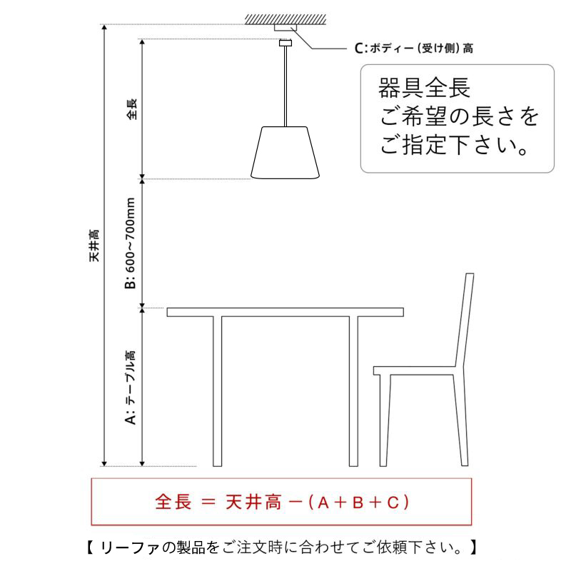 引掛シーリングキャップ上端(※上記 配線器具の厚みは含みません)から、器具下端までが全長となります。加工は全長をご指定ください。※コード加工の際に、多少の誤差が生じる場合がございます。予めご了承ください。