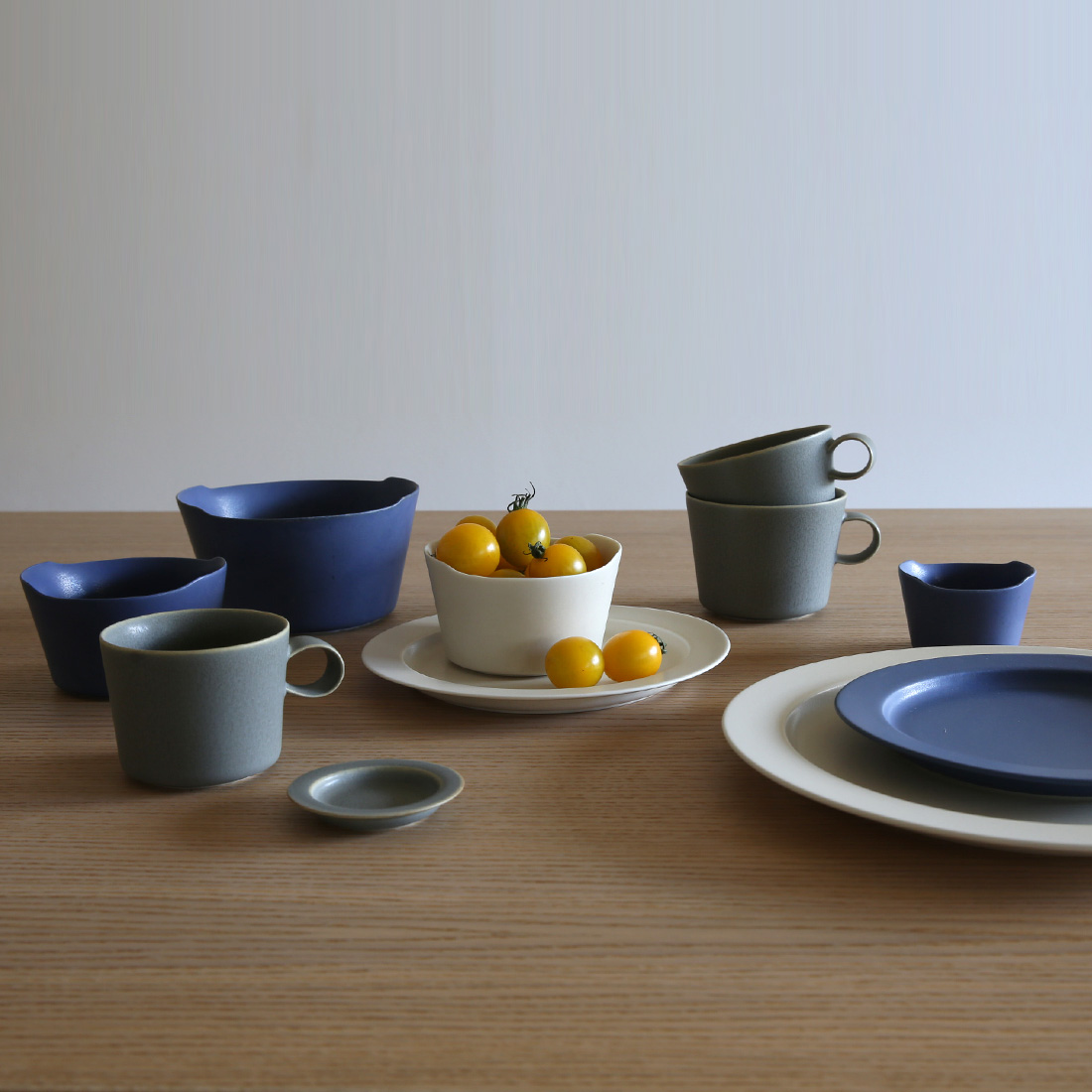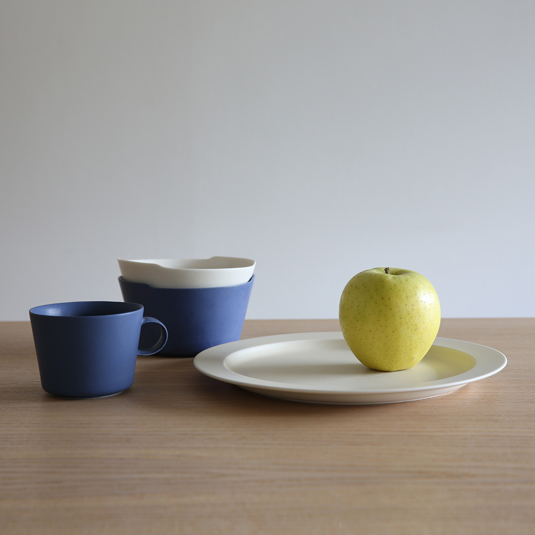 unjour(アンジュール)シリーズは、1日の時間帯によって使い分けることを想定して、「matin(マタン)」=朝、「apres midi(アプレ ミディ)」= 午後、「gouter(グテ)」=おやつの時間、「nuit(ヌイ)」=夜更けと名前がついています。シンプルな形ですが釉薬(ゆうやく)の色に奥深さがあり、一見するとツヤを抑えたマットな質感のようですが光を上手く取り込むので、角度を変えるとうっすらと輝き何とも言えない独特な風合いが姿をみせます。瀬戸の工房で職人さんたちが手作業で作っているため、1つひとつの表情が異なっているのも魅力です。