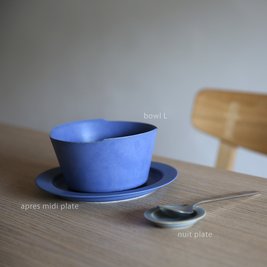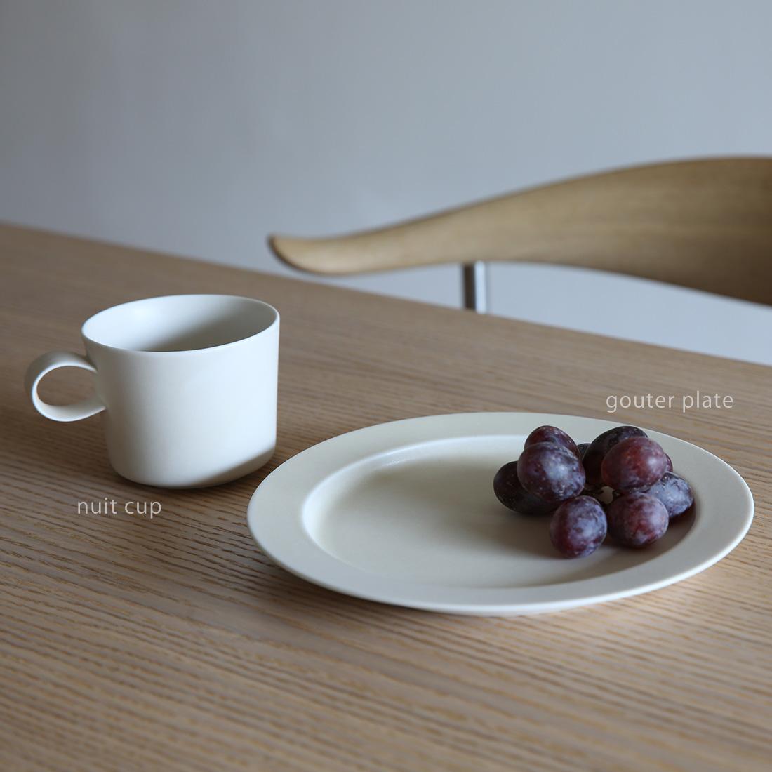 忙しい朝にワンプレートで朝食をいただくことができるmatin plate(マタン プレート)、午後のお茶の時間にケーキやお菓子をのせられるapres midi plate(アプレミディ プレート)、取り皿やカップのソーサーとしても使えるgouter plate(グテ プレート)、一口サイズのチョコを夜更けに楽しめるnuit plate(ヌイ プレート)。それぞれサイズによって、食卓風景が浮かんできます。