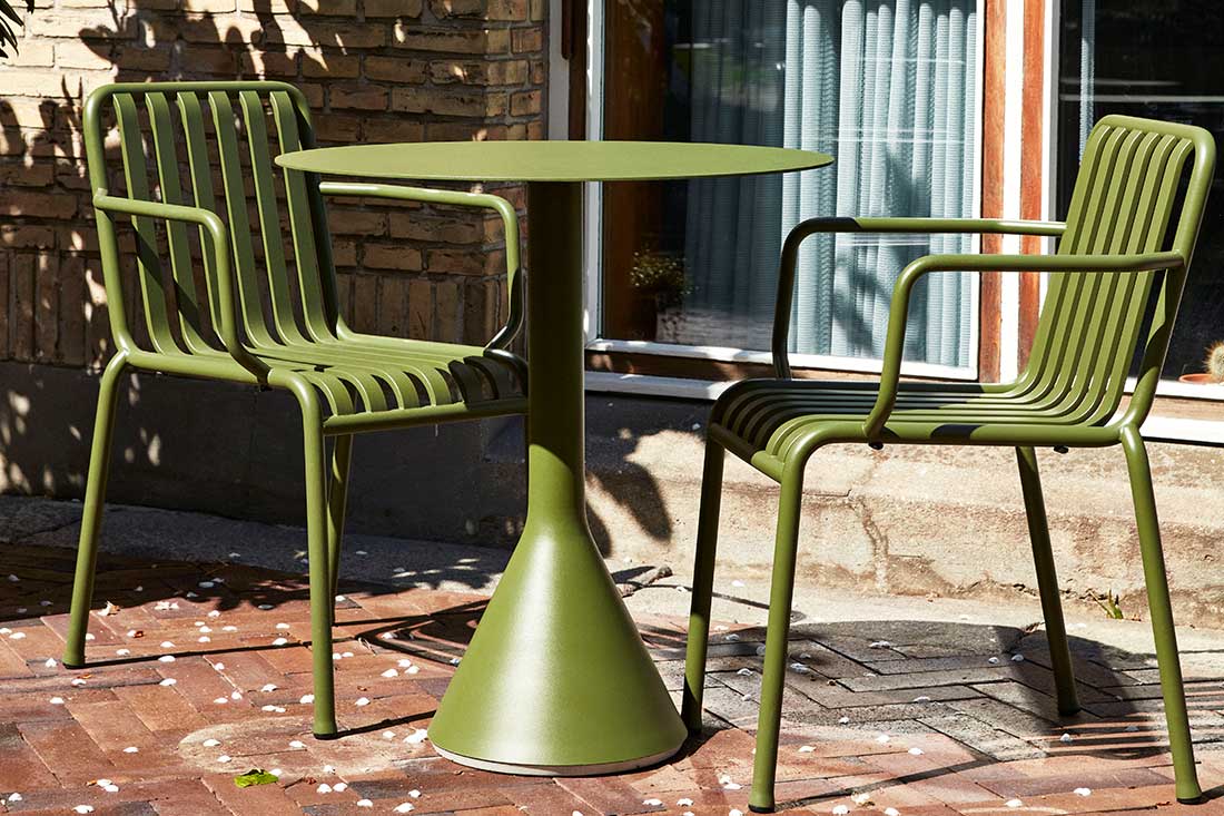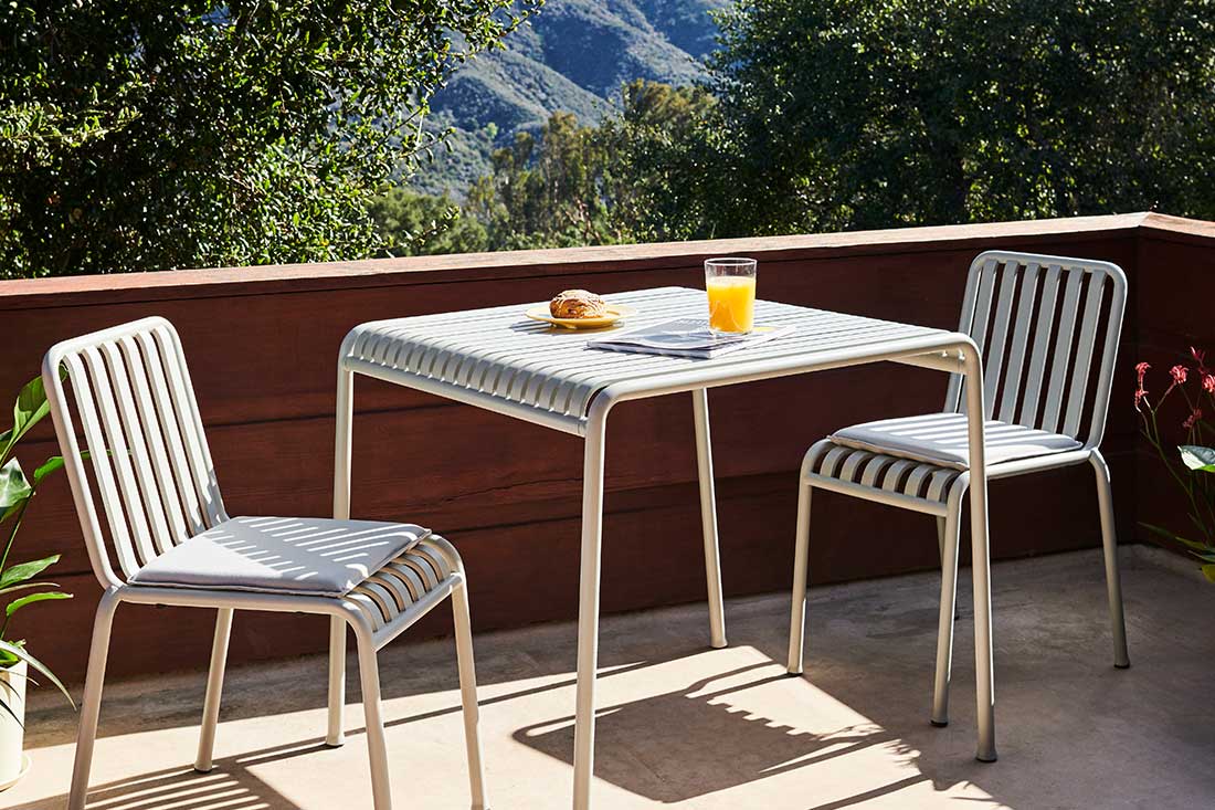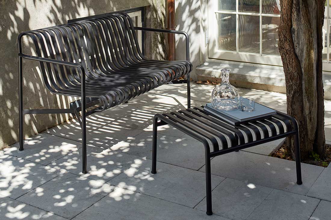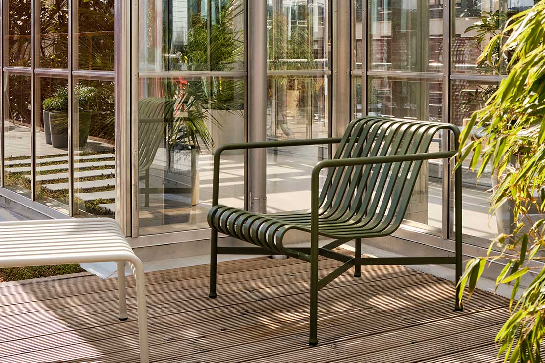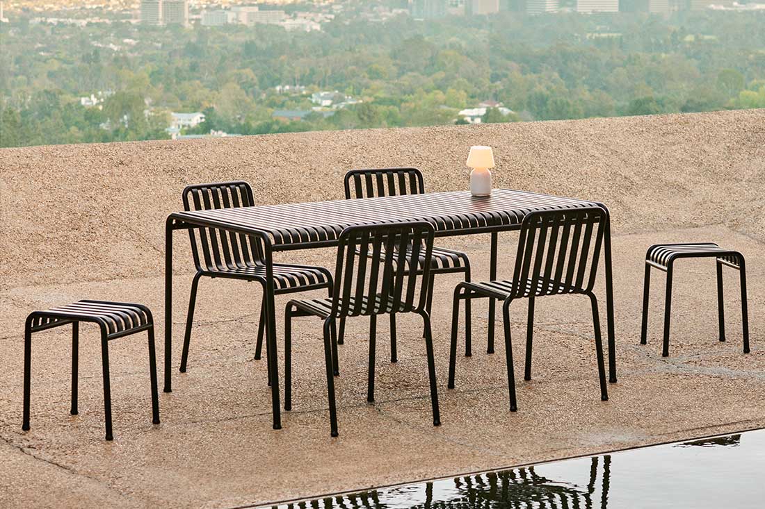 HAYのPALISSADEシリーズは、フランスのブルレック兄弟によるデザインで、「シンプル・機能性・適応性」という哲学が反映された屋外家具コレクションです。無駄を削ぎ落としたシンプルなフォルムは、洗練されたエレガントな雰囲気を醸し出します。
