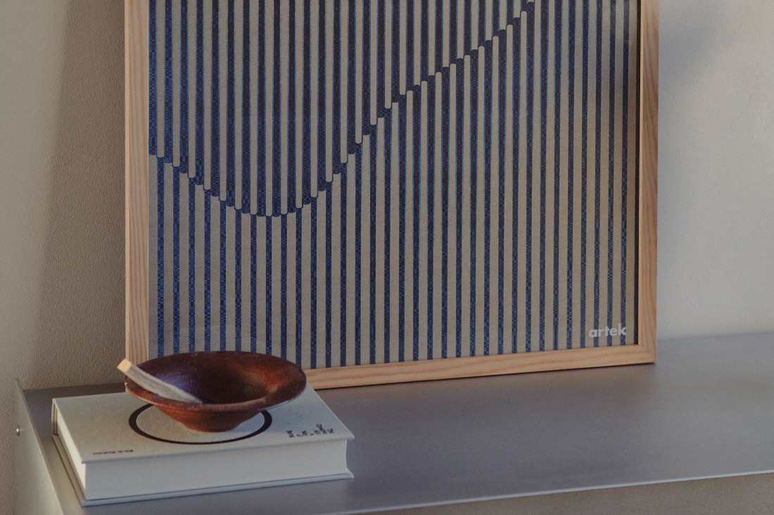 インカ・ベルの作品は、アナログな版画と最先端のテクノロジーを融合して製作されています。 Artek 90 Anniversary Posterは、アルヴァ・アアルトがデザインした「スクリーン 100」からインスピレーションを得てデザインされました。 「スクリーン 100」は、パイン材を垂直に並べ、繋ぎ合わせたシンプルな構造をしており、空間に自然の温かさと柔らかさを添えるパーテーションです。用途や好みに合わせて、直線的に用いて間仕切りとしても、保管するために巻いておくことも、流れるような曲線型として配置することもできます。 フィンランドを代表する建築家でありデザイナーのアルヴァ・アアルトらしい有機的で柔らかなフォルムは、時を越えて愛され続けています。 ≪SCREEN 100について詳しくはこちら≫ インカ・ベルは、青と黒のインクを層状に重ね、さらにさまざまな角度からレーザーカッターで彫刻のように彫っていく、シルクスクリーン印刷の実験的な手法を用いて、「スクリーン 100」の輪郭を再解釈しました。 アルテックの馴染みある有機的なフォルムと、インカ・ベルによる想像を越えたテクスチャーが調和した特別なポスター。あなたの暮らしと住まいに取り入れてみてはいかがでしょうか。