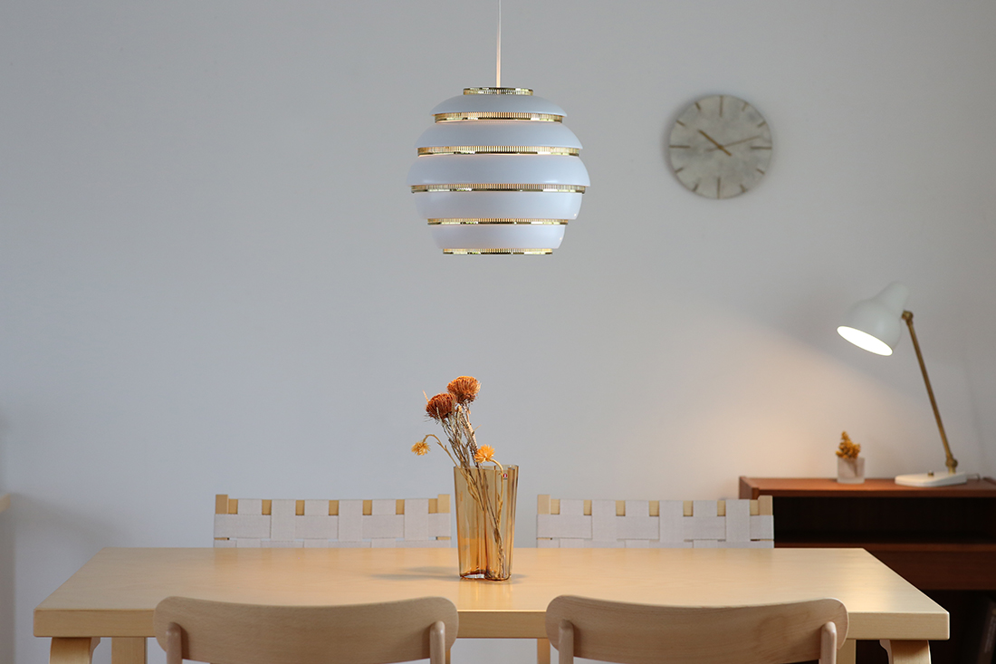 アアルトとアイノの建築においては、自然光をできる限り多く取り入れるよう努め、空間の中で自然光と照明の灯りが戯れながら、相互に作用することを大切に考えていました。 心地良いと感じる自然光に近い灯りと、アイコニックなアルテックのペンダントライトは、今もなお世界各国の人たちに愛され続けています。