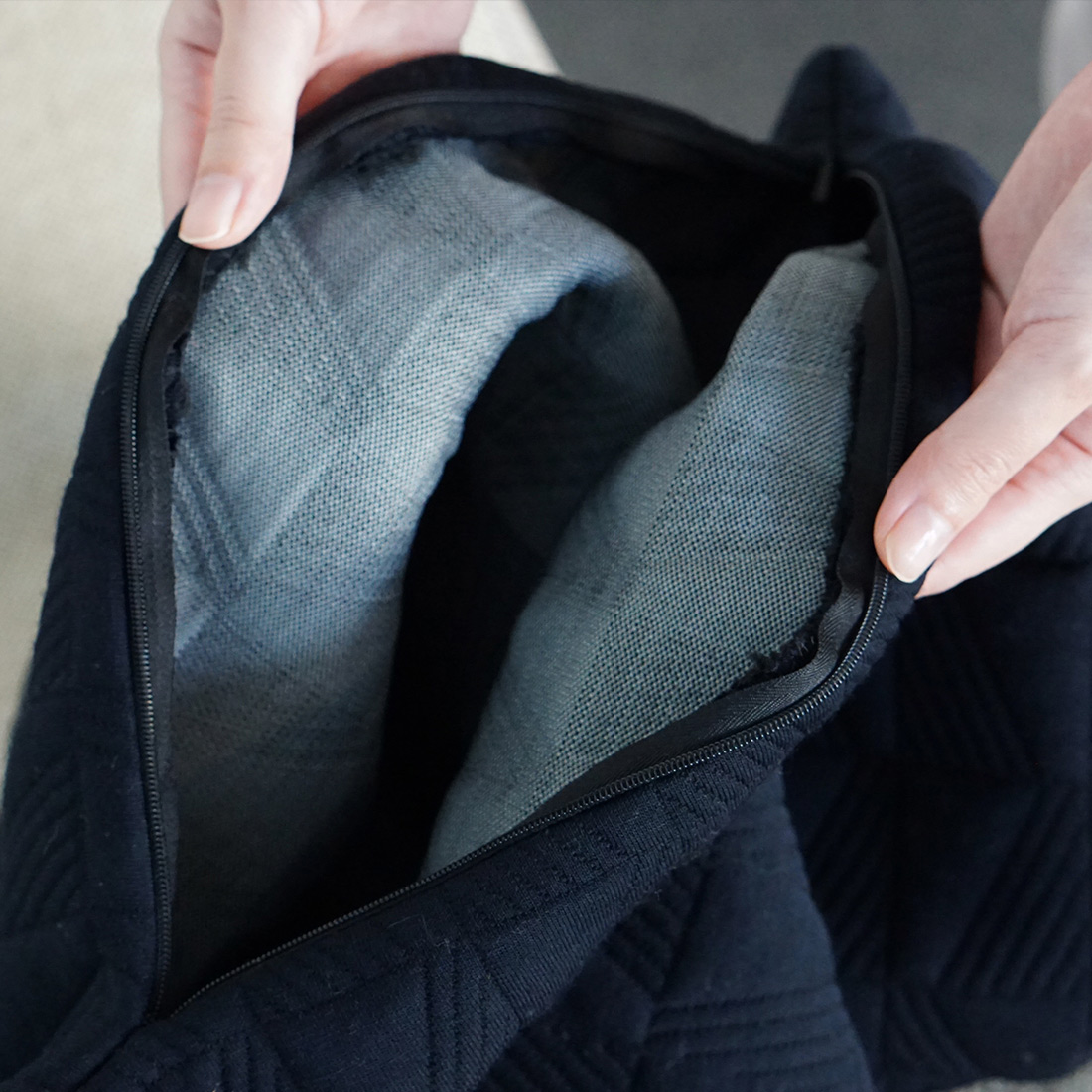 また、やわらかな触感でありながら、表情がだらしなくならないのは、カバーが二重構造で仕立てられているためです。内側と外側、二層が重なることで、ふんわりとした感触の中に、ほどよい厚みと安定感が生まれています。
